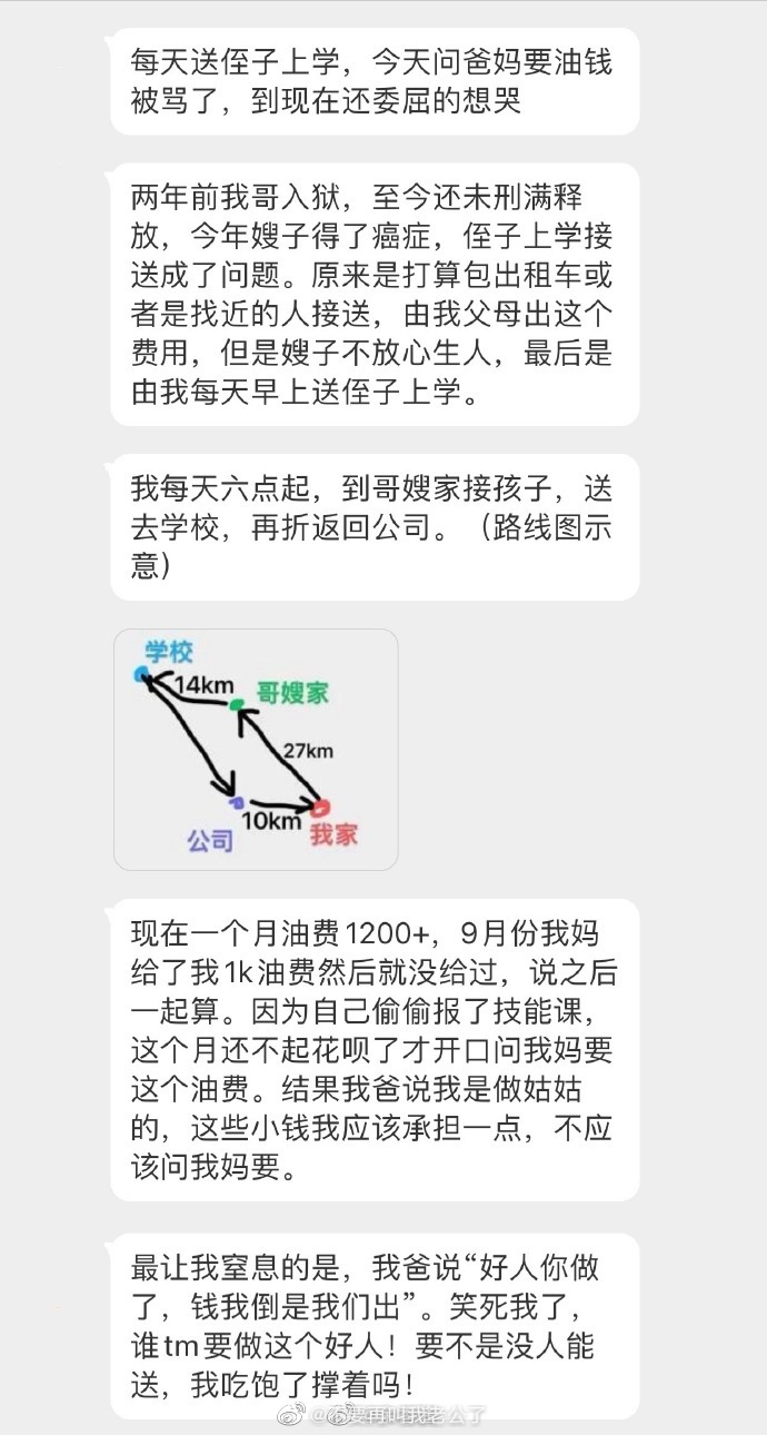 每天送侄子上学,今天问爸妈要油钱被骂了,到现在还委屈的想哭