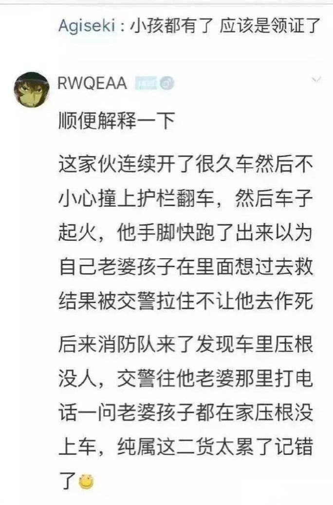 不是开车太久所以太累嘛[笑着哭]老婆孩子一开始就没上车 在家 那这个大哥一开始不累的时候也没发现啊[笑着哭]不过有一说一 跑了以后敢跑回去救这确实是个好爷们