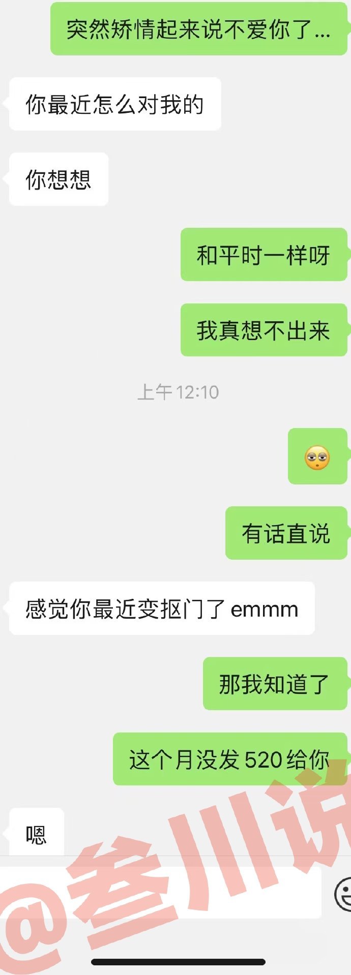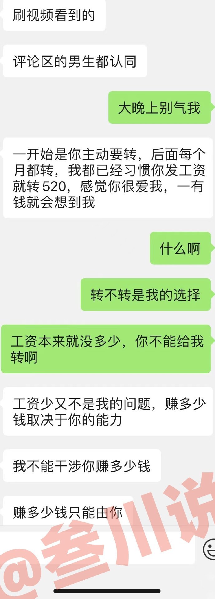 女朋友和我在一起后每个月都会转520给她,这个月我想存点钱就没转,她说我不爱她,还说了很多雷人的话,大家看看她是不是被毒鸡汤洗脑了?