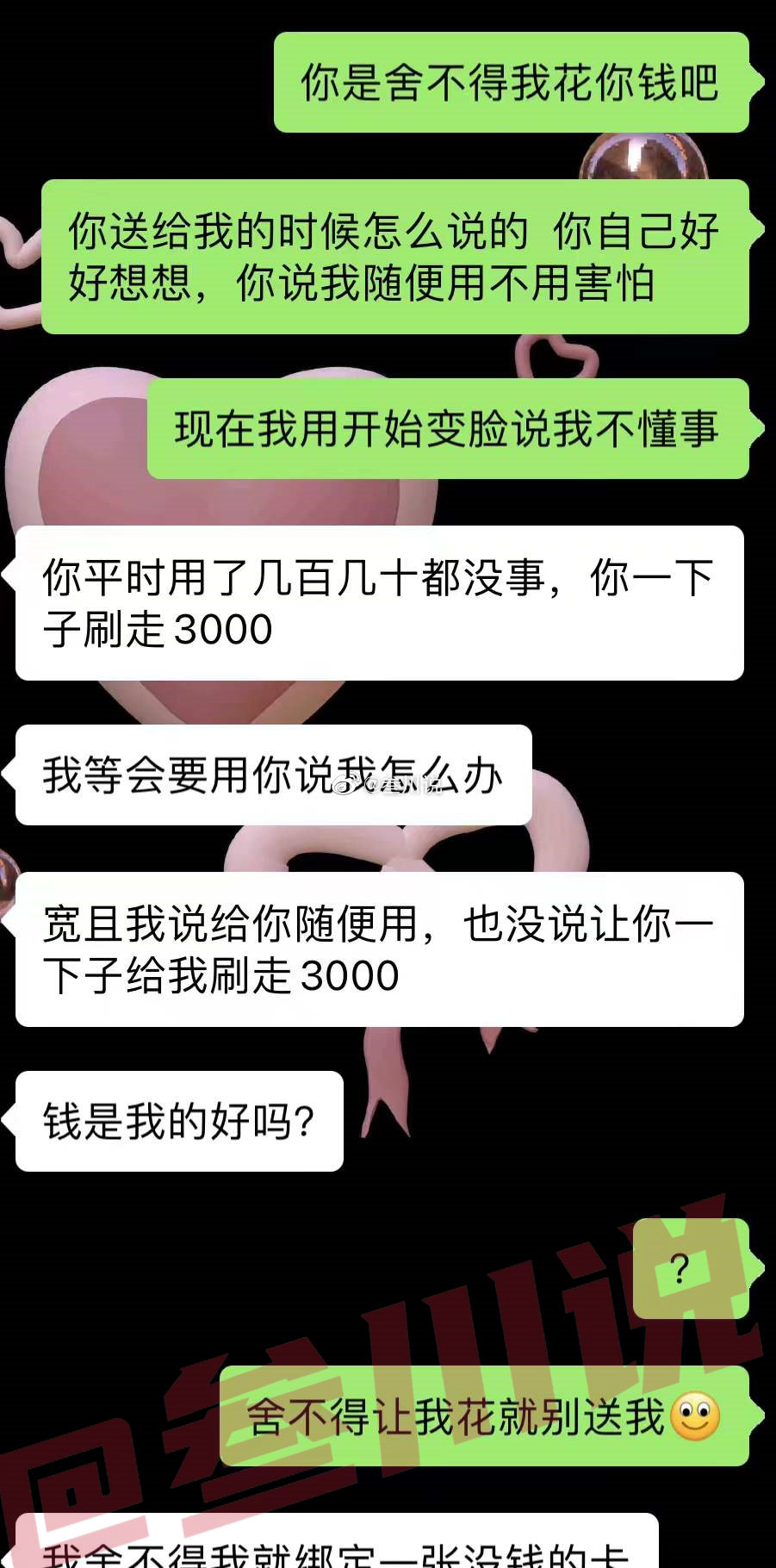 男朋友在我生日送我亲属卡,亲口对我说随便用,现在我用了后他又对我发火,说我没礼貌
