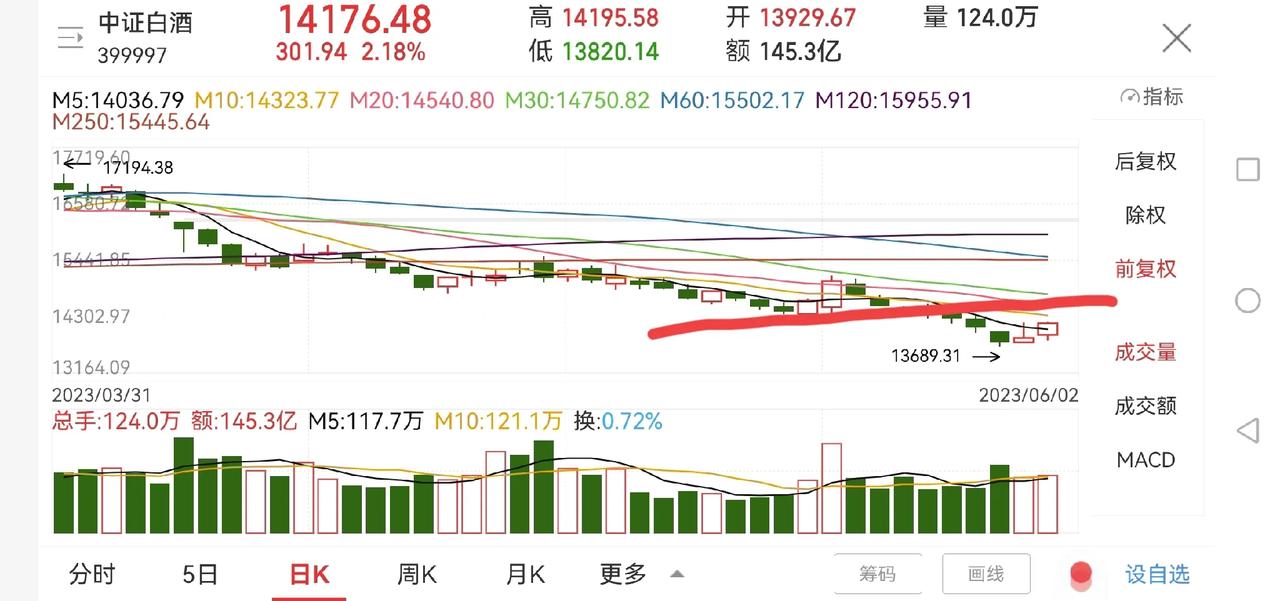 白酒后面迎来加仓机会? 周五中证白酒大涨2.18%,目前看最多算是反弹,因为上方还压力重重,我们来分析下。 从月线级别来看,目前中证白酒基本上是横盘震荡在一个区间里(如图),目前距离箱体下沿比较近,只能说近期风险相对之前较小,适合做波段。 从日线级别来看,中证白酒马上就要到达压力区(如图),重点看这个区间能否突破。从均线来看,都是向下形态,想参与我觉得还是需要等5日均线拉平甚至开始拐头向上才比较合适。
