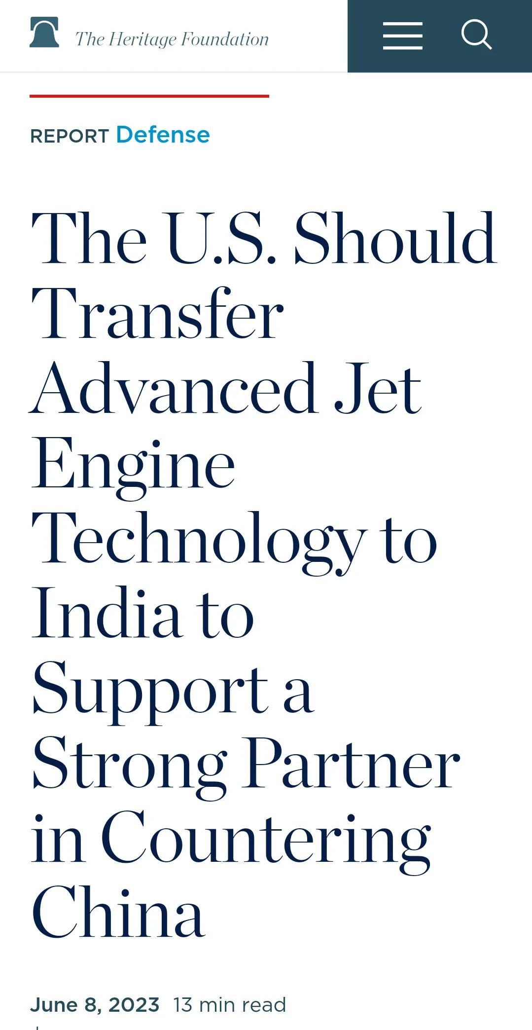 【美专家建议向印度转让军事发动机技术,但也提出了合作条件】华盛顿智库“传统基金会”发布报告称,美国应该向印度转让喷气式发动机技术,因为这有助于美国支持对抗中国的强大伙伴。该报告作者是亚洲研究中心主任史密斯(Jeff Smith)与前F16飞行员JV Venable,后者在美国空军曾服役25年,他们认为,向印度转移先进的军事发动机技术,对华盛顿和新德里“影响深远,而且互惠的”,将推动印太地区“集体安全”,并将美印防务伙伴关系推向“新高度”。 报告称,拜登政府正在评估莫迪政府提出的要求——将美国最先进的战机发动机F414技术转让给印度,他们认为,为了保持防务关系的发展势头,两国政府都有责任向对方和国内支持者证明,为什么这些交易符合两国的长期利益。 为此,两名作者提出了三个主要观点:1,美国制造的战斗机发动机是世界上最强大、最可靠的,保护这种技术优势符合美国的国家利益;2,美印都“日益担忧”中国威胁,印度是“四方安全对话”(QUAD)的关键成员,与印度加强防务关系也符合美国的利益;3,美国应批准向印度转让技术,同时“降低相关风险”,并寻求与新德里进行新形式的防务合作。 很显然,美国一方面想要充分利用印度抗衡中国的战略价值,另一方面又想防止出现“肉包子打狗”的意外情况,所以,他们希望印度政府在得到美国技术时也要有所表现,比如购买美制军事装备取代俄罗斯武器,让美国在印度能有军事存在等等。当前形势下,莫迪政府能够顶得住美国的诱惑吗?