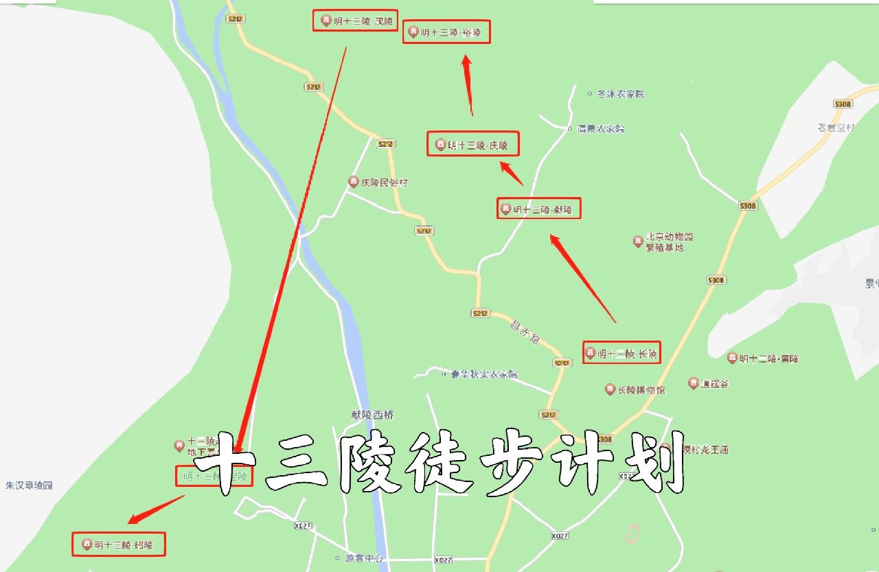 路线:长陵→献陵→庆陵→裕陵→茂陵→定陵→昭陵。