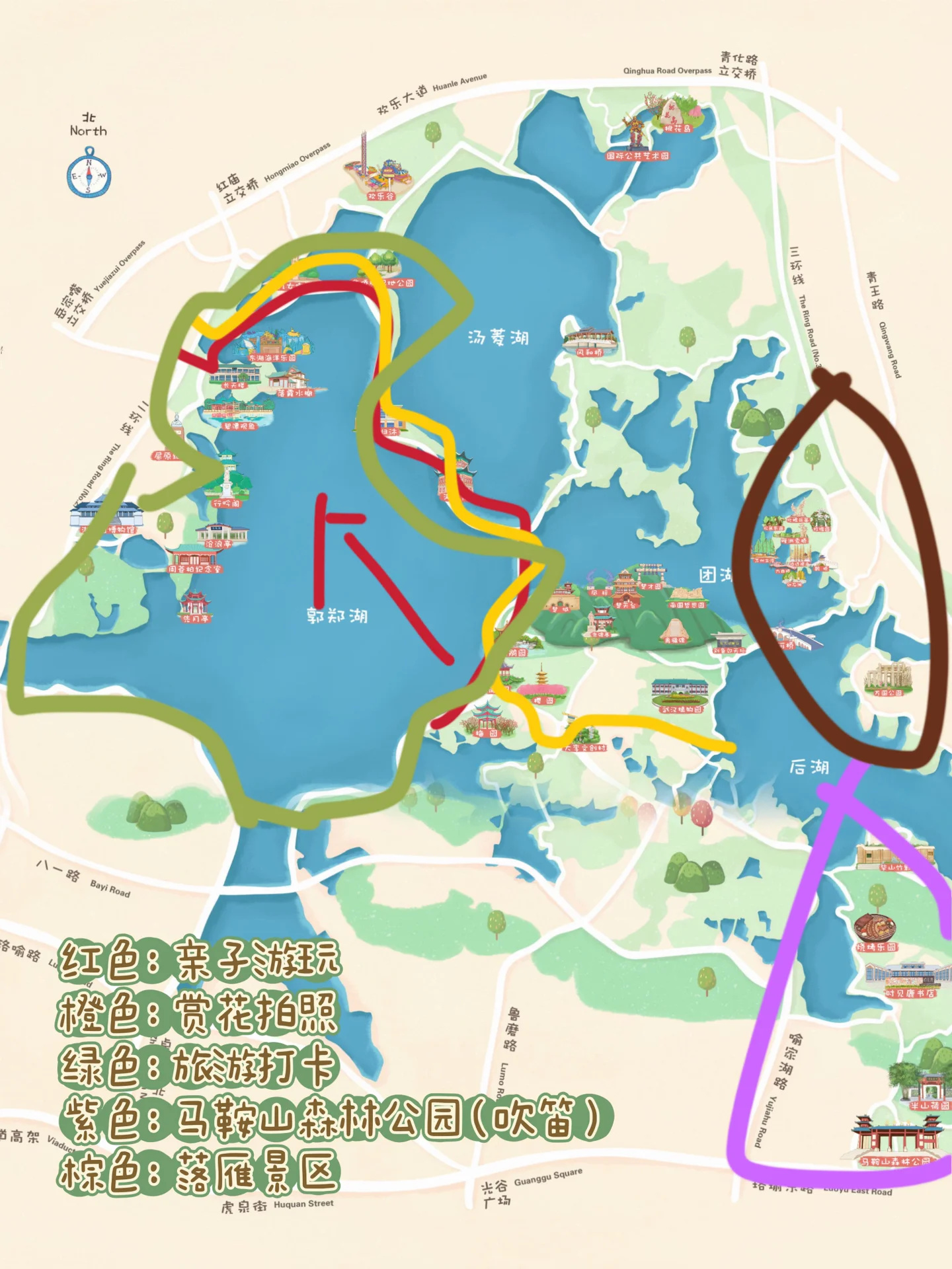 以下路线围绕听涛、磨山,建议落雁岛和马鞍山森林公园单独打卡