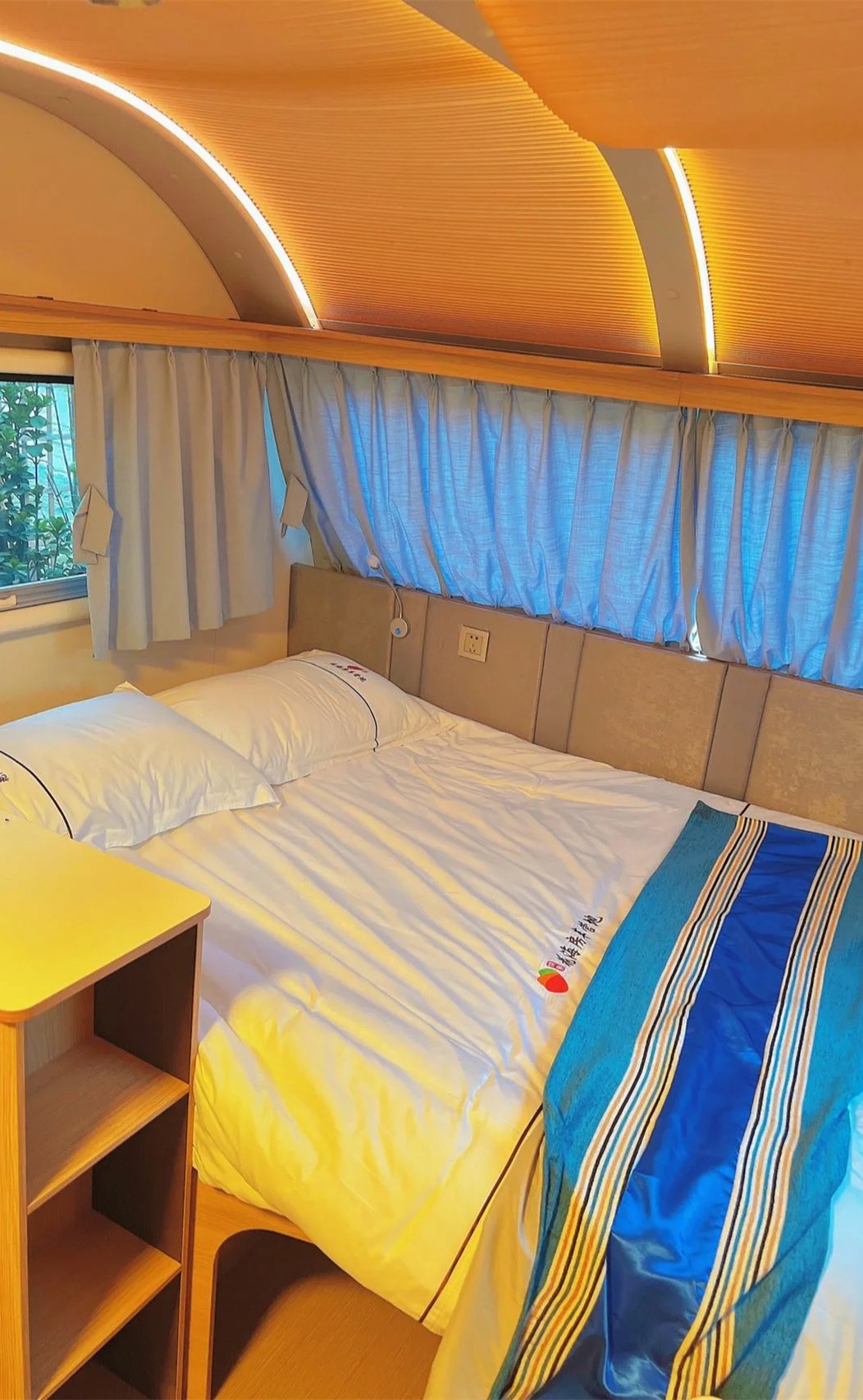一辆辆房车干净整洁,设施完善,卫浴、电视机、空调、冰箱、全身镜……