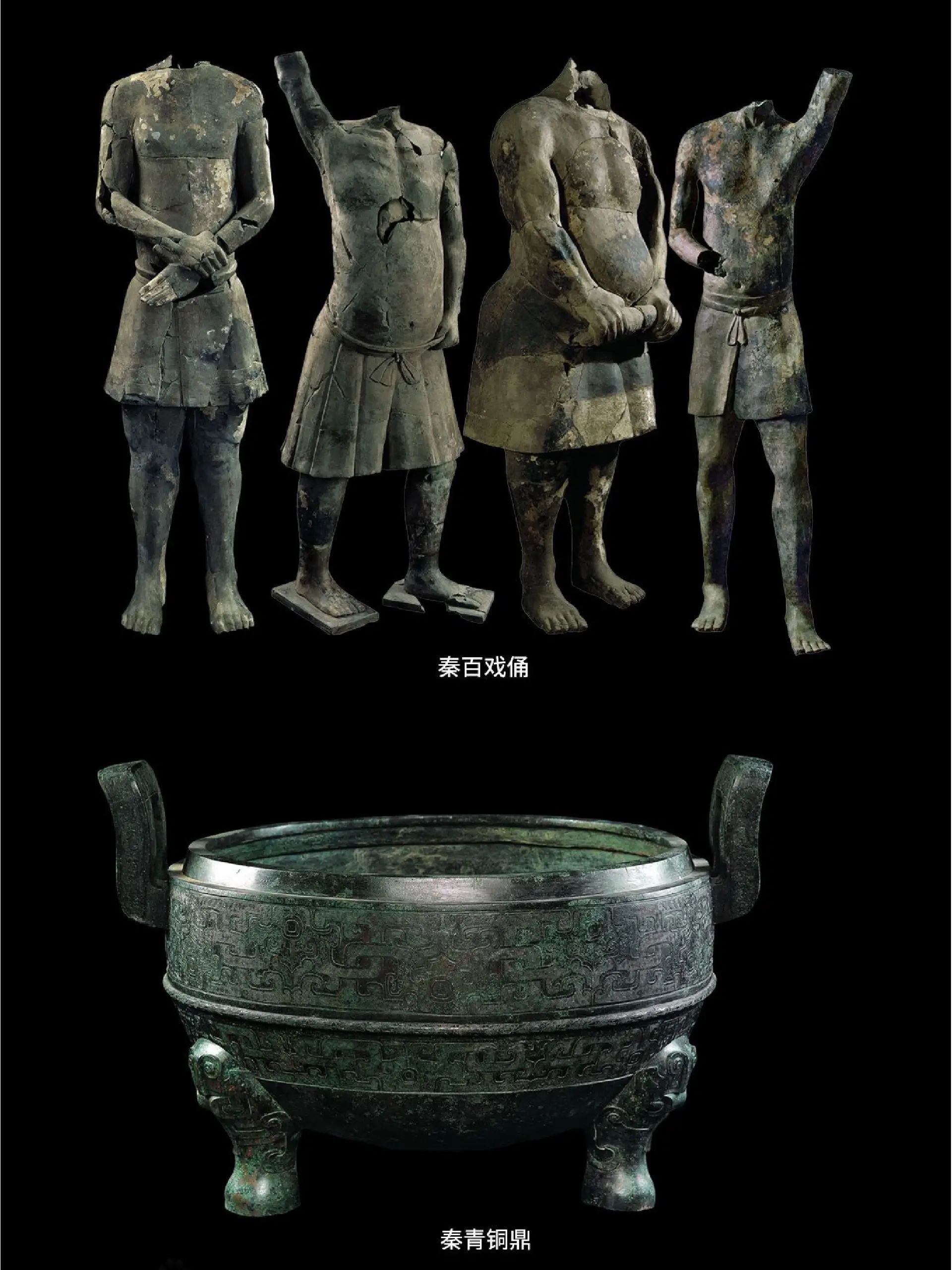 秦青铜鼎:是出土于百戏俑坑的一件青铜鼎,有学者认为应该是举鼎时的一件道具,也有人认为是礼器因为秦末战乱而被掩埋。