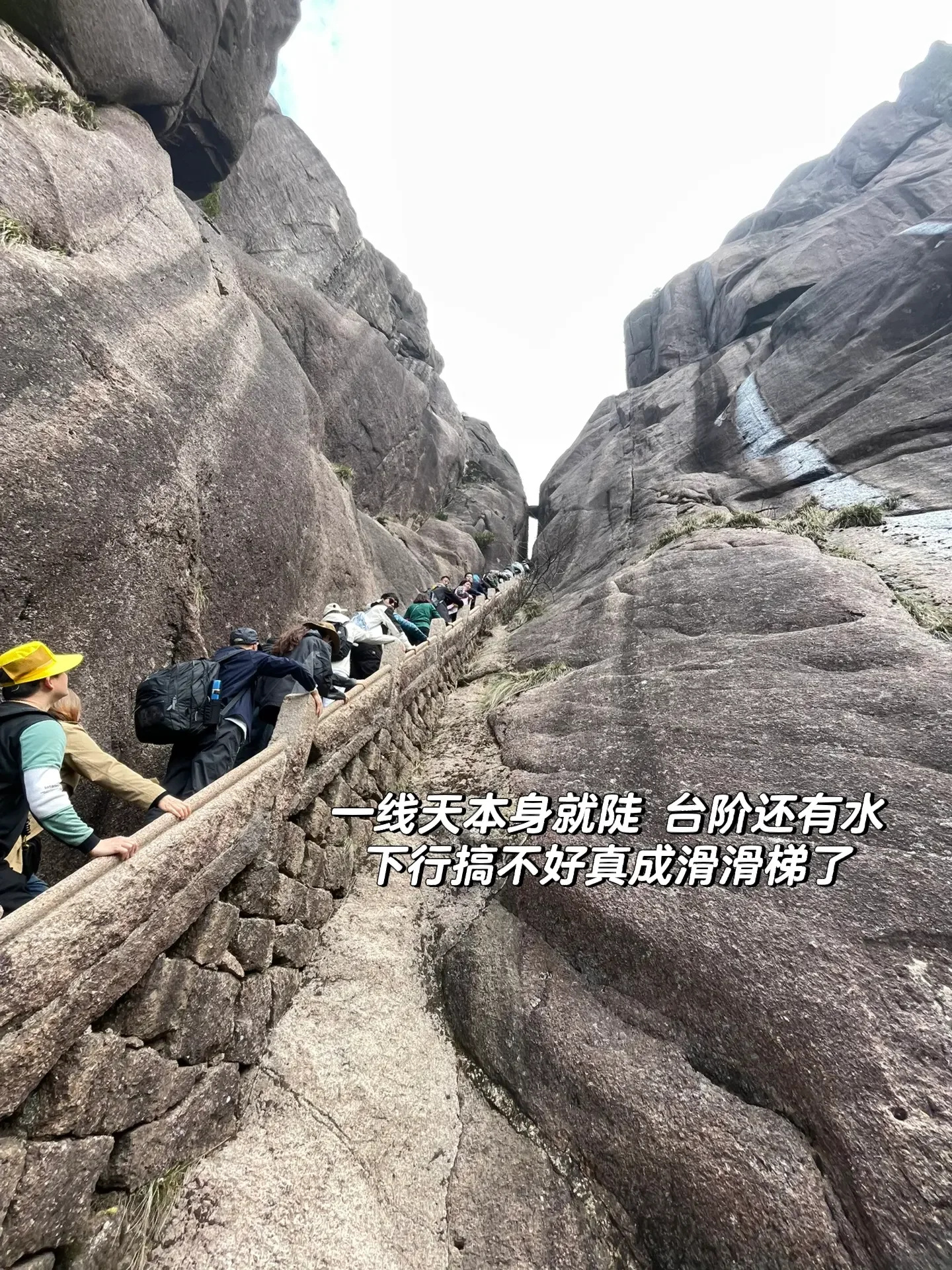 而且每个台阶都很高,就这路上行还好,下行一个不小心出溜滑人就到山下了,路上遇到下山的人没有不腿抖尖叫的。
