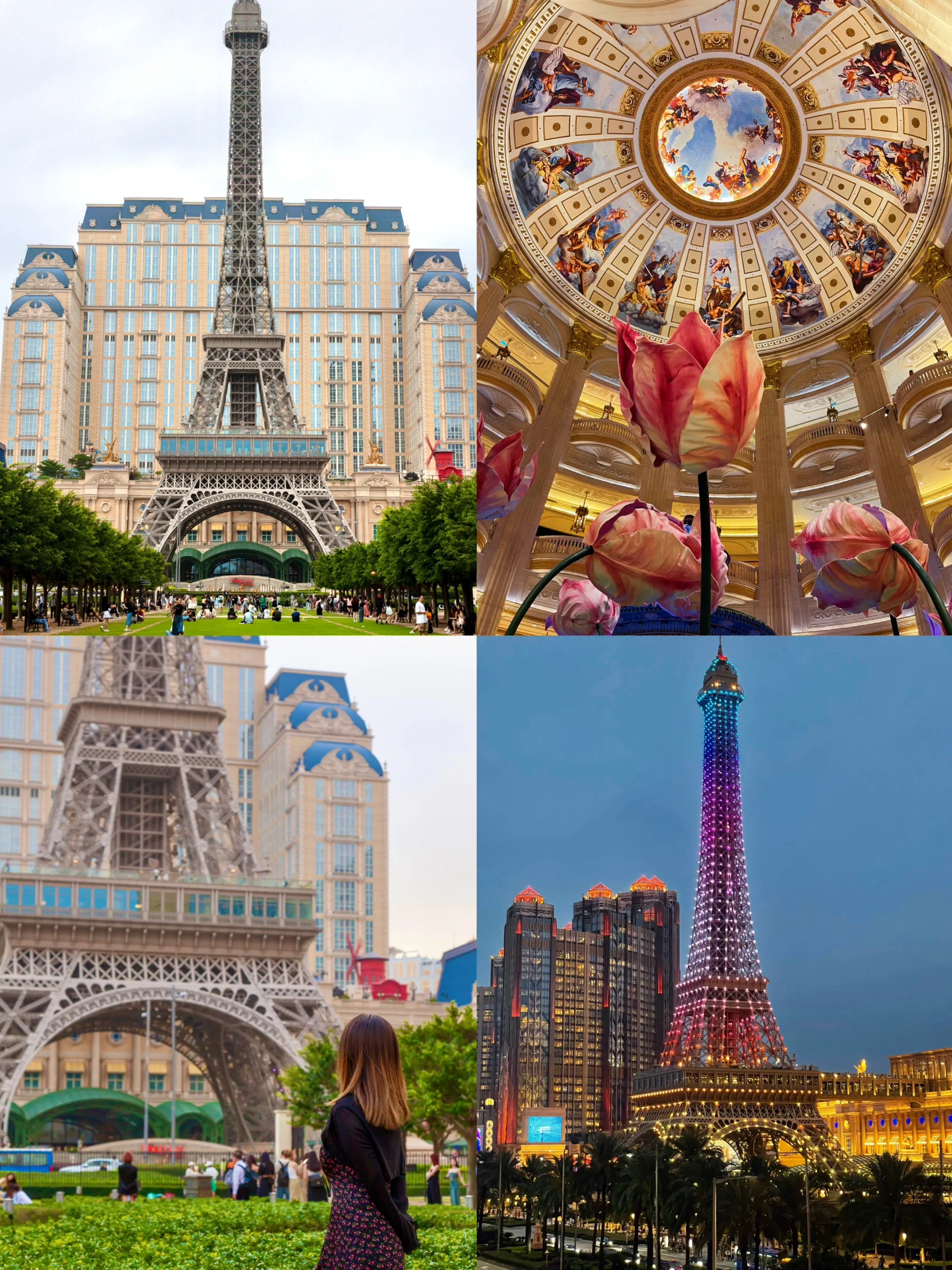 从「巴黎人」走过来,先经过四季名店的空中走廊,拍红色双层巴士和亮灯的巴黎铁塔。