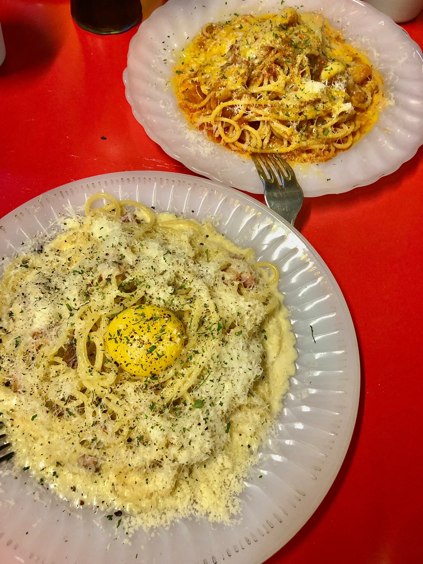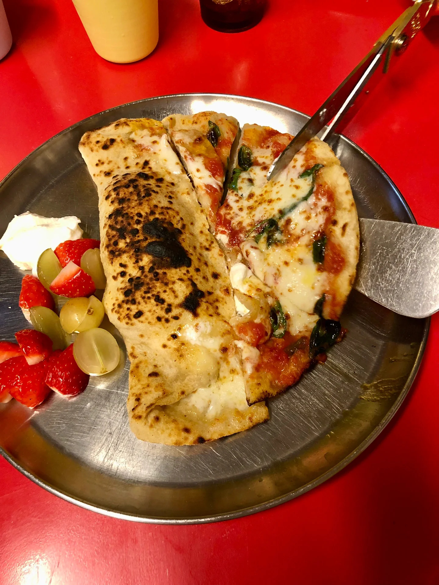 点了两款披萨和两份意面,披萨是手工现做现烤薄皮的,里面有芝士,一份披萨两种口味,吃完非常非常惊喜,至少在上海我没吃到过同样口感和味道好的披萨意面。