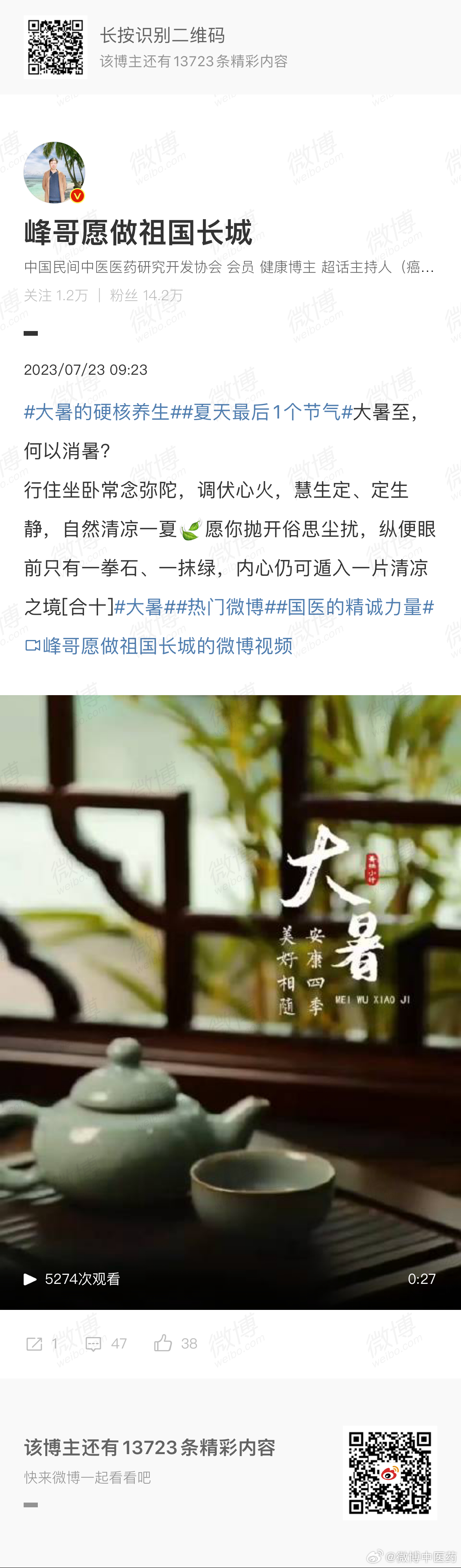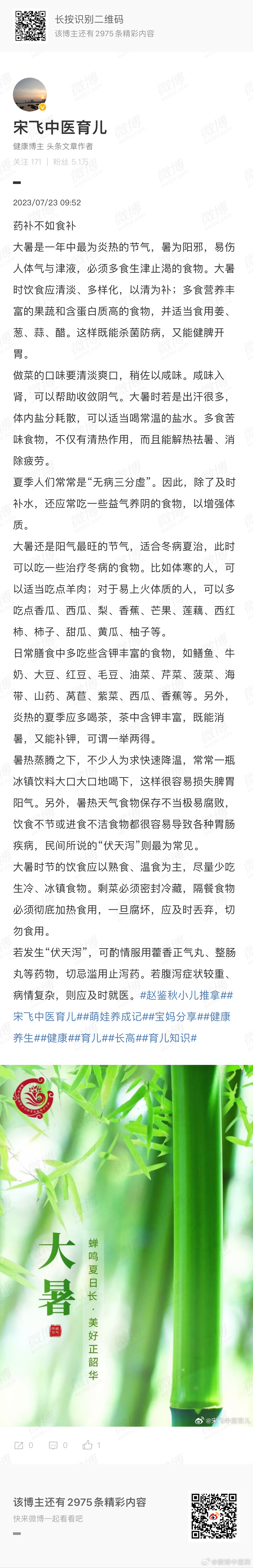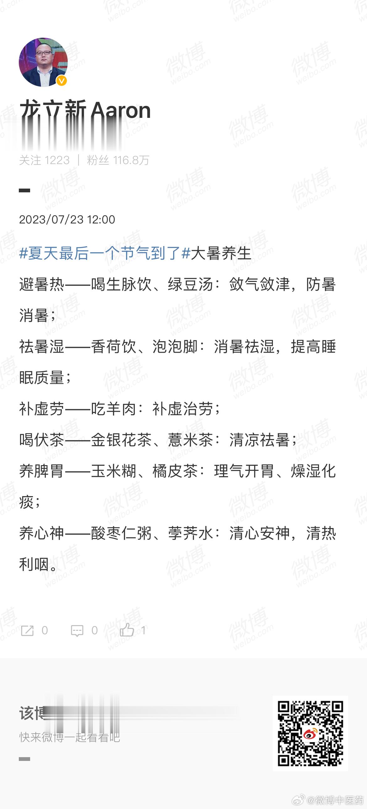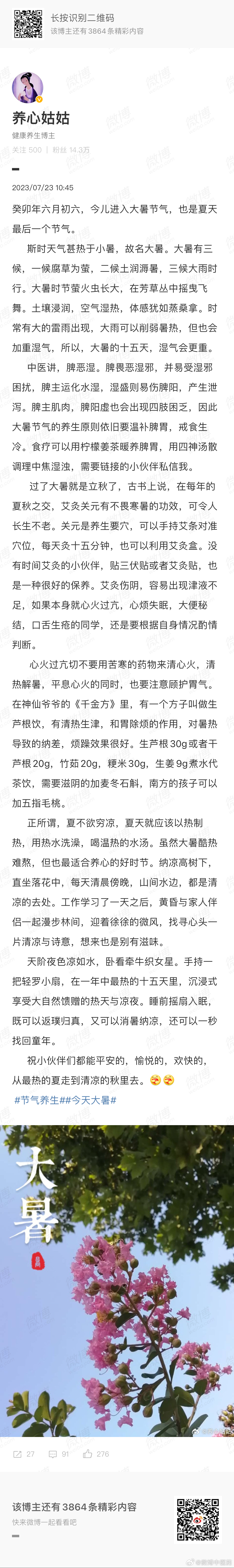 俗话说“小暑大暑,上蒸下煮”。大暑,一年中气温最高,阳光最烈,也是夏天的最后一个节气。大暑节气是一年中阳气最盛的时候,适合冬病夏治。“湿热交蒸”在此时到达顶点。大暑节气该如何养生呢?又有哪些注意事项呢?#国医的精诚力量#