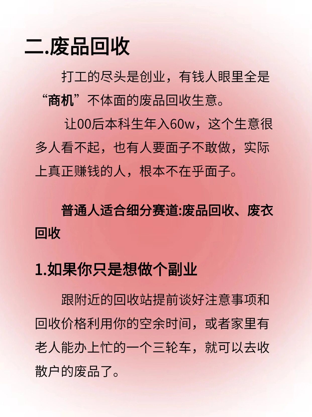 不起眼的生意往往最赚钱,很多时候我们看上去不起眼的摆地摊,收废品的,他们家里都是很有钱的。 这些看上去不起眼的小生意不需要太高的要求,正适合我们这样的普通人,踏踏实实也可以赚大钱!!