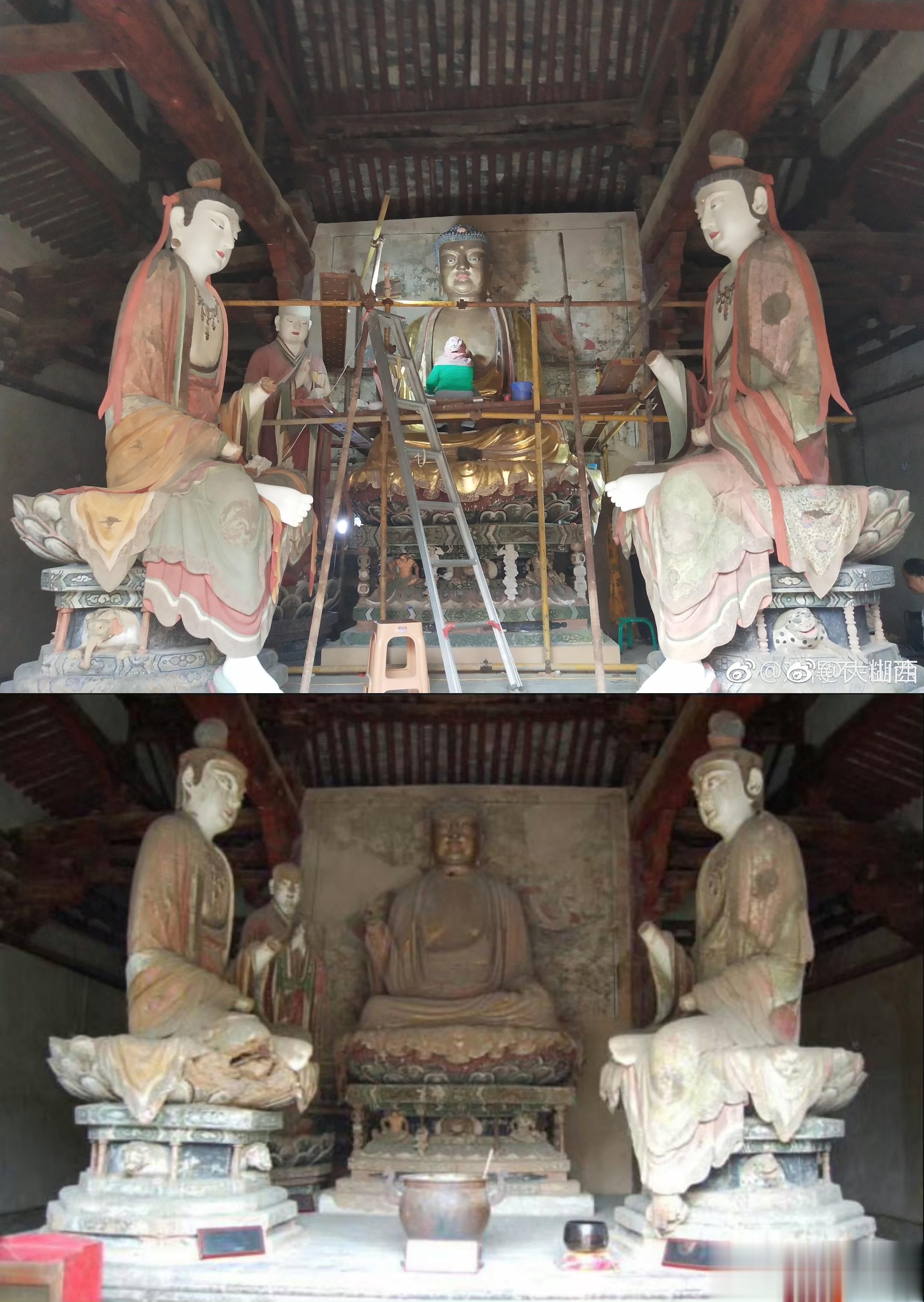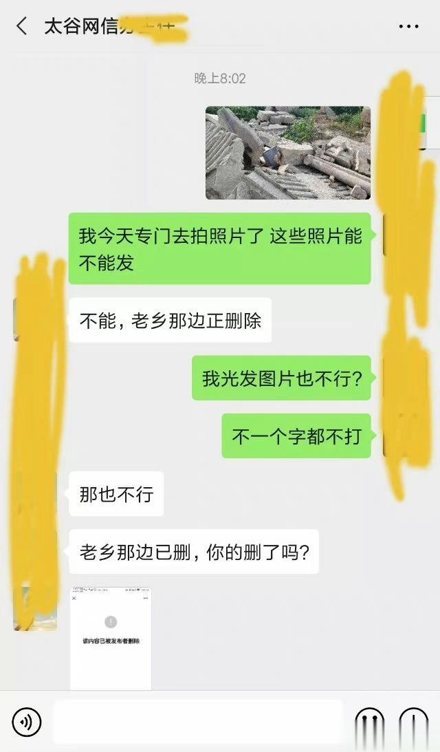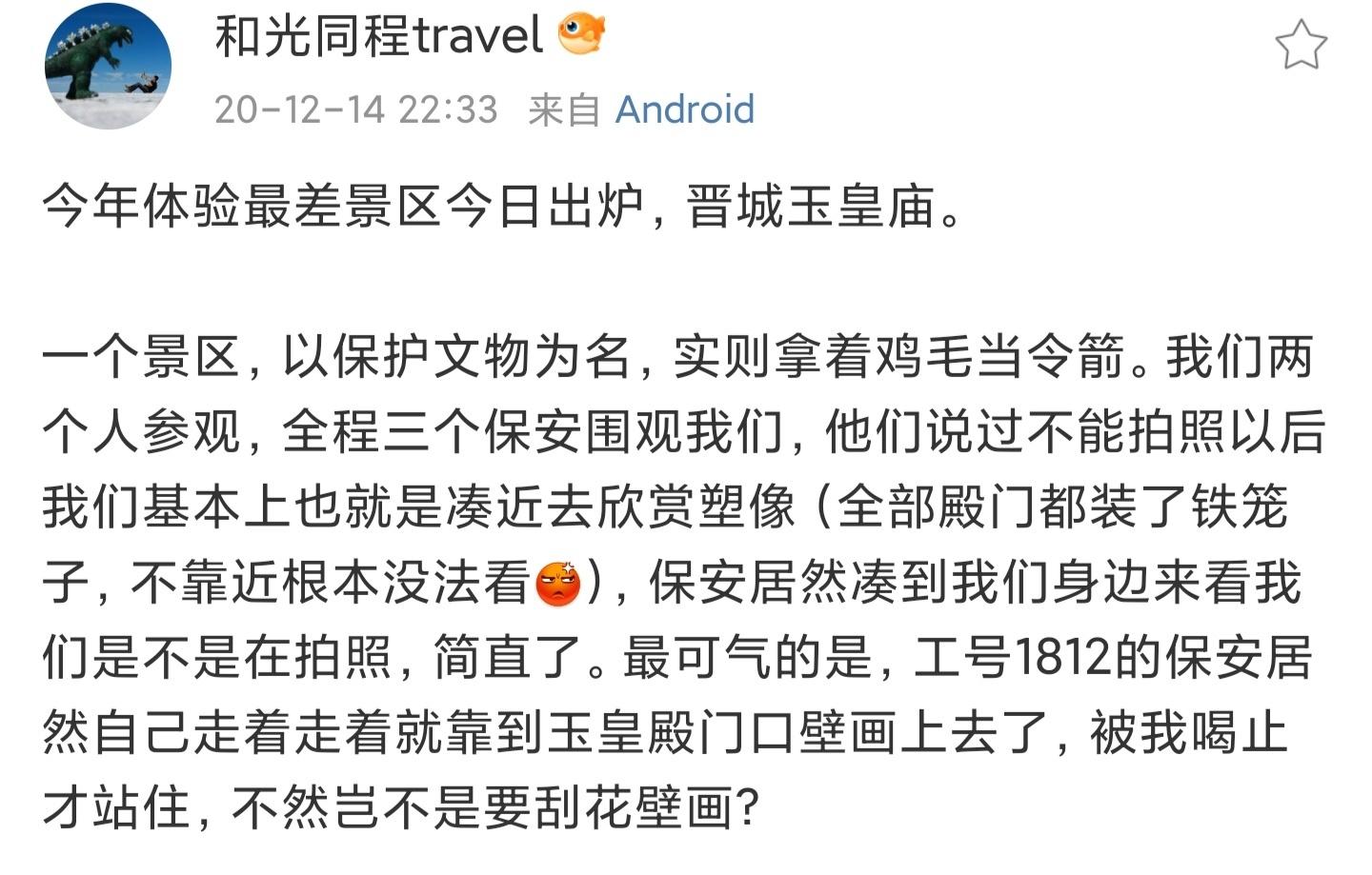 3. 逃避监管的主要特征就是监守自盗或文物破坏后防止舆论发酵,因为毕竟没人拍到,所有管理的失职就没有任何证据,这其中青莲寺塑像破坏式修复后禁拍(图4)、府城玉皇庙禁拍时被抓到保安剐蹭壁画(图5)、太谷牌坊倒塌后第一时间禁止现场拍摄(图6)、巩义石窟盗拓禁拍……凡此种种都是典型案例,基本都是管方对文物保护极不负责,才打着保护文物的旗号禁止拍摄,当然巩义石窟寺以弃暗投明,值得表扬