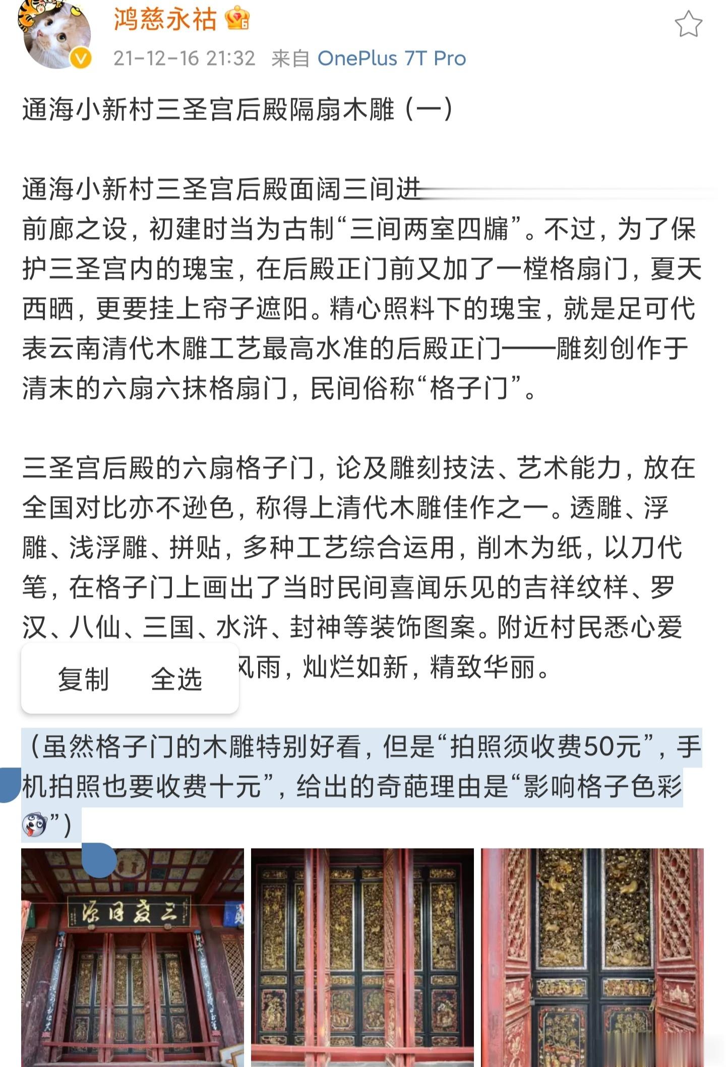 最后还是劝下各文物机构能存些初心,挣钱可以但不要吃相太难看,有一点对守护文物的责任心,能够以弘扬中华文明的优秀文化为己任,为文物事业多尽份力,以推动科学先进的文保思想在华夏大地落地生根;另外也希望广大民众能慢慢转变一些根深蒂固的错误认识,多了解科学,不要人云亦云,不要妖魔化摄影技术,百年之后视今日可能犹如我们嘲笑清人怕拍照把魂拍走一样。最后,今日大家争取来的很多古迹摄影自由来之不易,也望诸君一道珍惜!