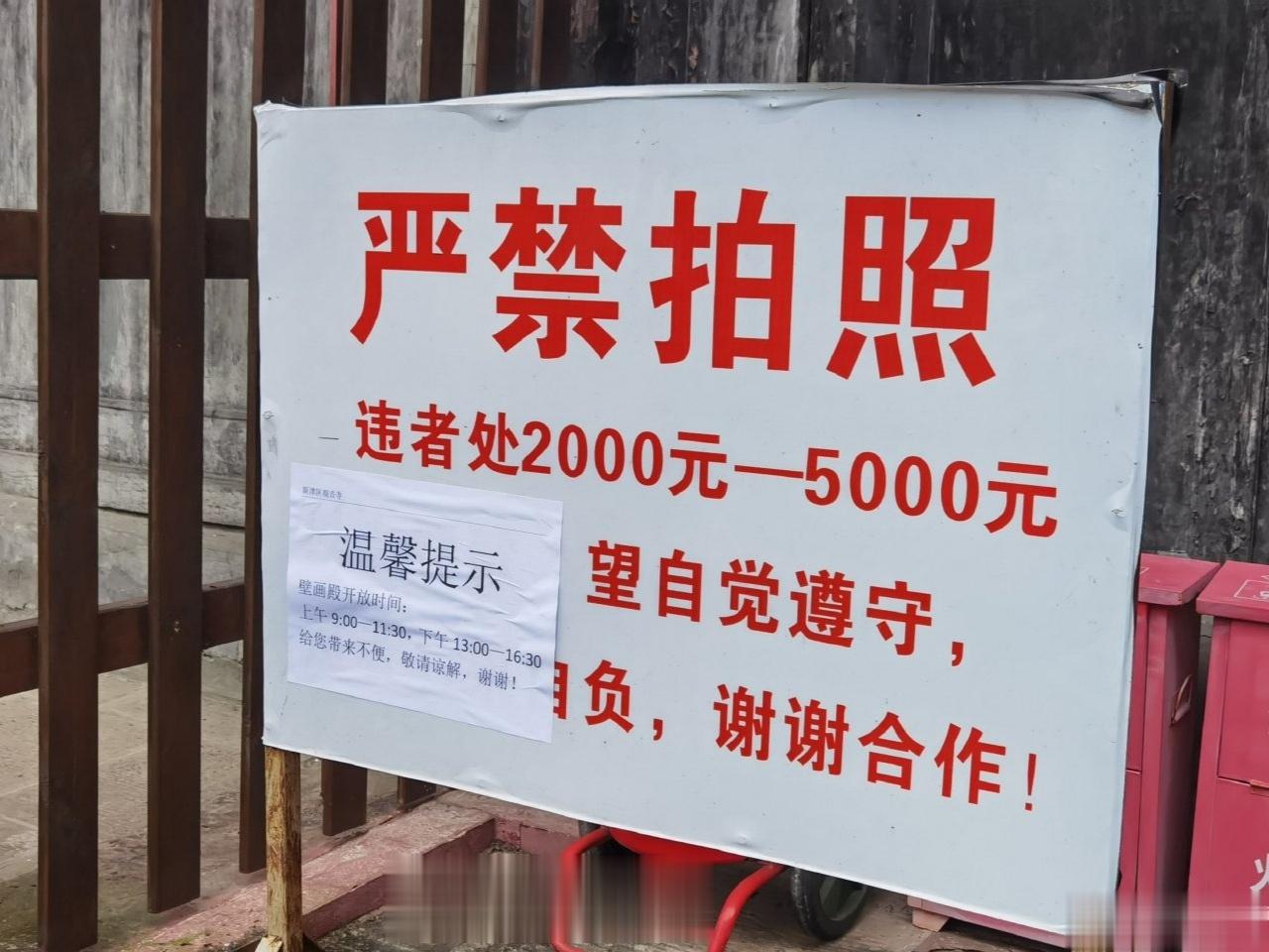 5. 当然,很多文保单位明知拍摄无关文保,却依旧禁止拍摄,这其中也有很多别的原因,莫高窟给出的理由是所谓“二氧化碳”,因为顶着研究院的名头也不好讲一些太反智的话,只能找一个过得去的说法,以达到垄断目的。当然还有很多地方是懒,纯粹不想也无心无力管理,因为拍摄会有很多参观秩序和宗教信仰纠纷,不让拍摄就免去了这些问题,索性就一刀切了,这种地方一般都标着禁止拍摄但也不执行。当然也有少数地方是宗教信仰原因,虽然我也不知道这忌讳是怎么来的,因为国内任何宗教没有任何一条教义对拍摄有约束,这里面大概是一些约定俗成的,因为宗教活动被拍也常惹纠纷吧;但是在文物场所明火且禁拍就讲不过去了,最著名的就是少林寺的初祖庵。