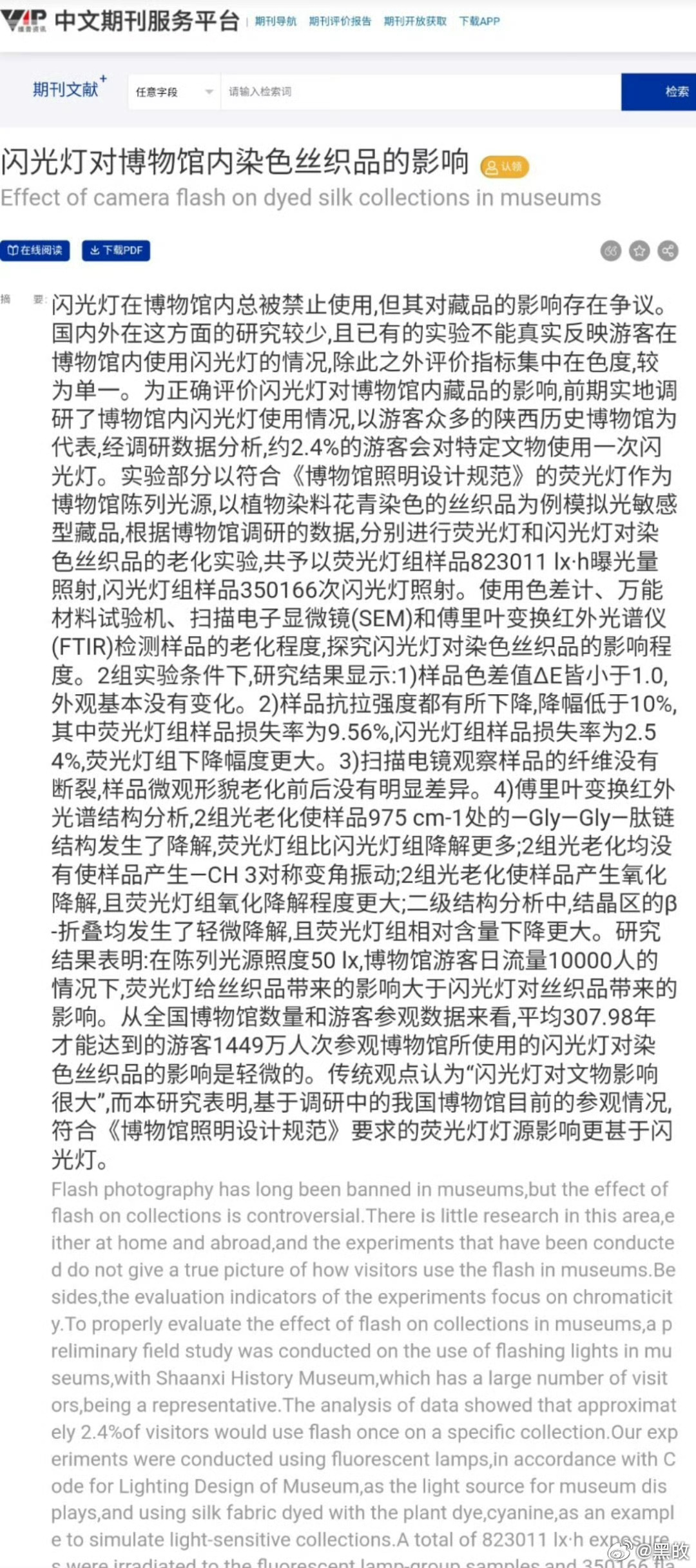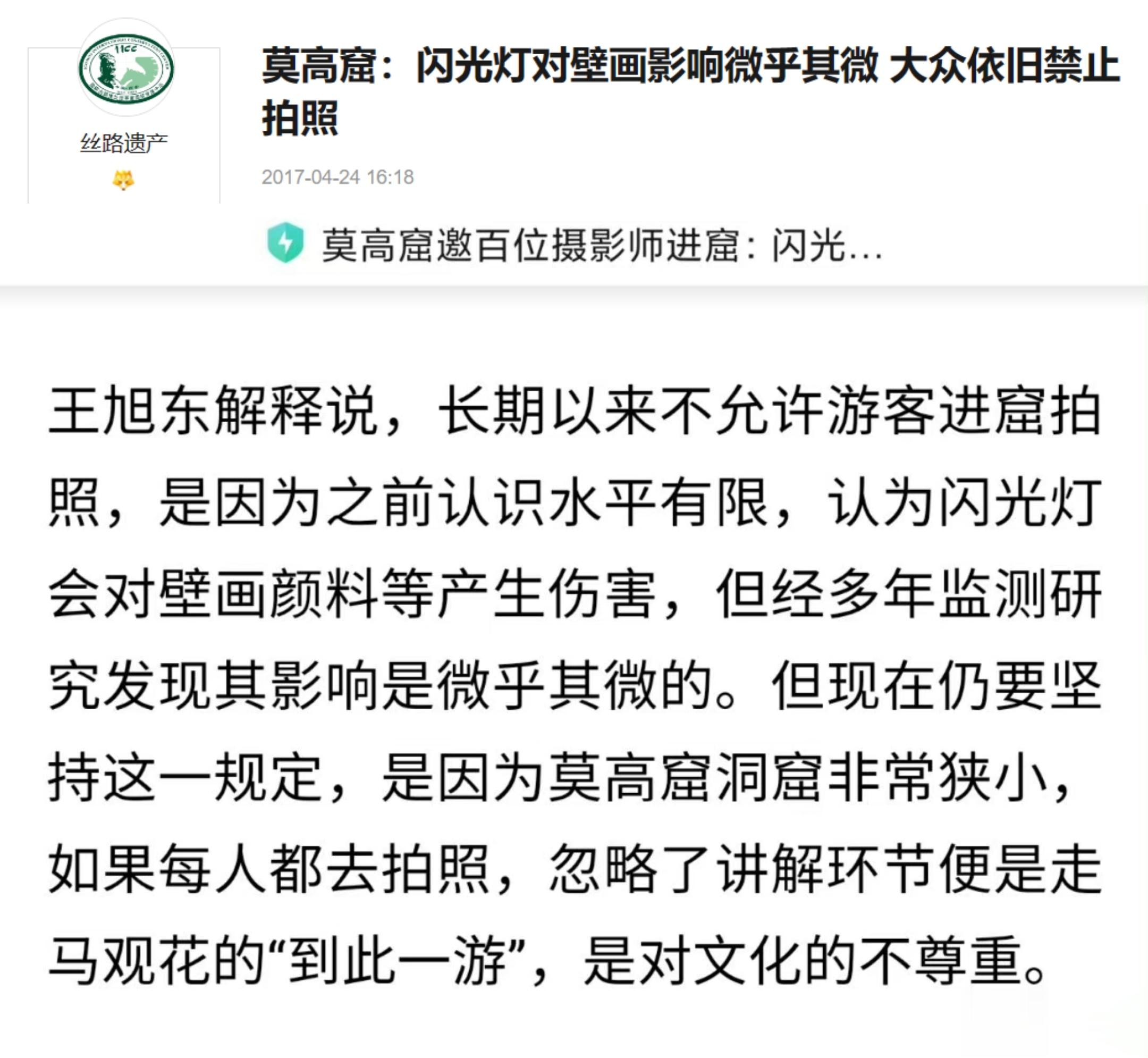 首先,不开闪光灯拍摄对文物完全没有任何影响,开闪光灯对文物的影响微乎其微。上述结论不是我说的,莫高窟自己就说过,敦煌研究院前院长王旭东和樊锦诗先生都亲口讲过(图2),当然文物怕闪光这个说法是由于之前文保工作者认知不足,采取谨慎的态度并无问题,但根据新近研究,闪光灯对文物的影响弱于环境光,对绘画和丝织品的影响也几乎可以忽略不记(图3)。当然开闪光是我极反对的,倒不是因为文物保护,而是闪光破坏了参观秩序。