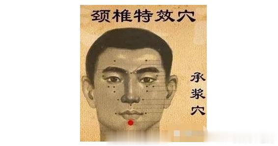 如果再配合揉揉承浆穴,效果会更好。承浆穴的位置,见下图,在承浆穴所在区域内找痛点按揉,就能有作用。