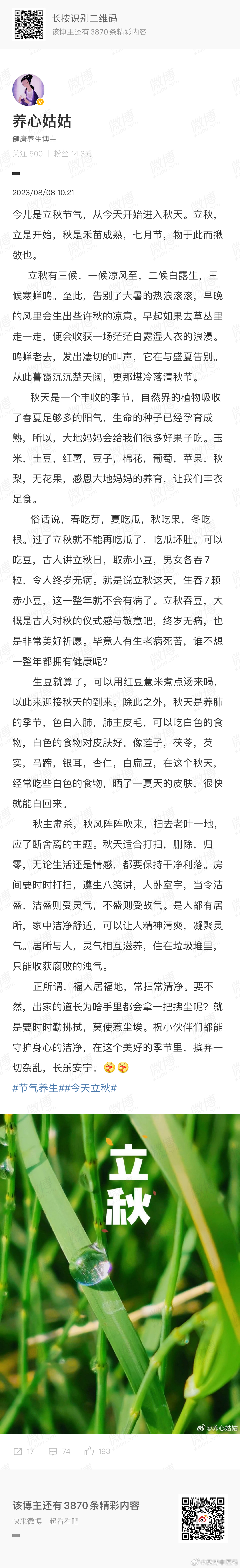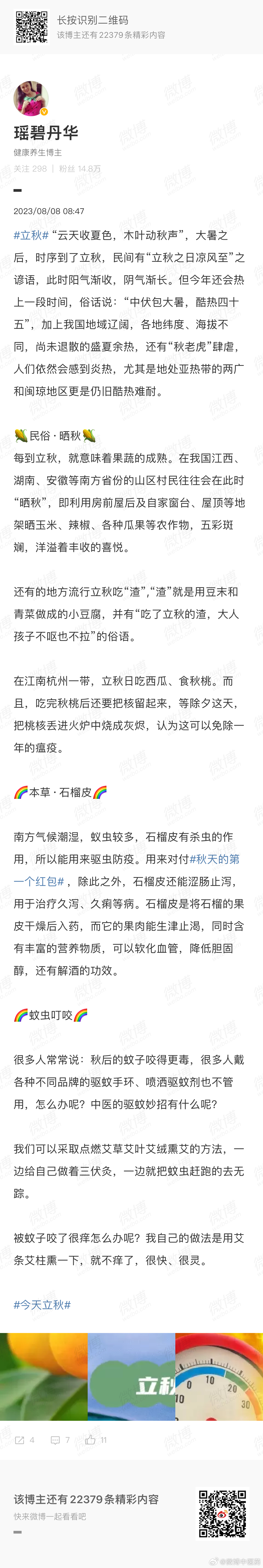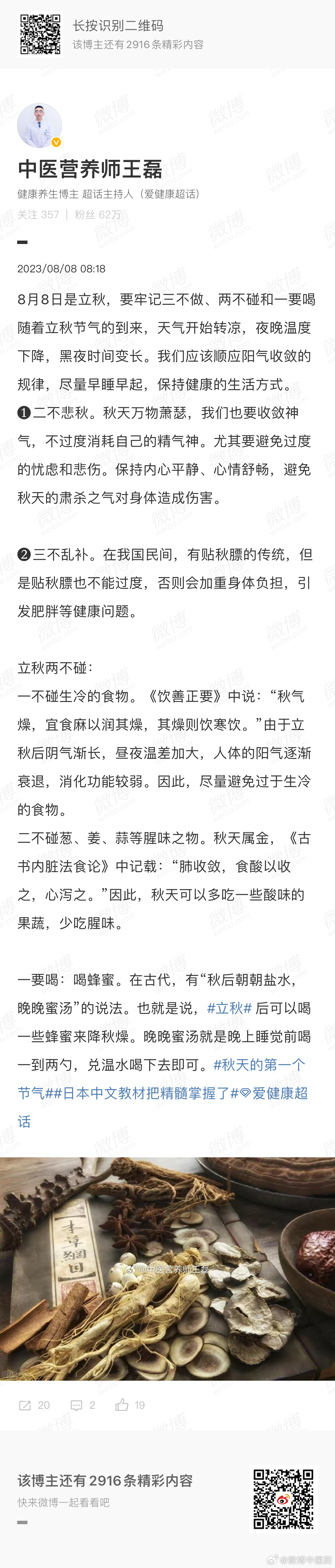 #国医的精诚力量# #立秋# 才感盛夏,忽而立秋。 不知不觉,夏天就快要过去。今天,我们迎来了二十四节气中的第十三个节气——立秋 。 立秋后如何正确养生?