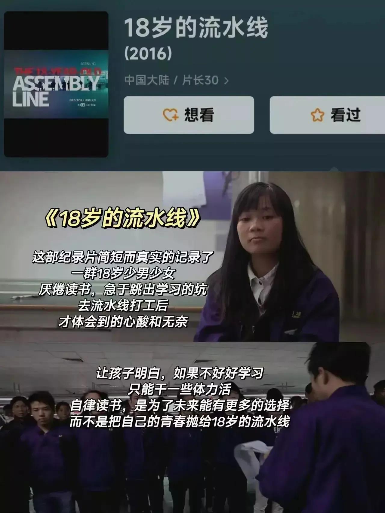 “太涨知识了!!”一位优秀的班主任指出:孩子不想读书时,就陪他看这8部纪录片吧!不仅能激发孩子对未知知识的求知欲,还能提高孩子的眼界。 就拿《18岁的流水线》来讲,这个纪录片真实记录了一群18岁的少男少女厌倦读书,着急跳出学习的坑,去流水线打工后,才体会的无奈和心酸。让孩子明白,如果不好好学习,只能干一些体力活,自律读书,是为了将来有更多的选择,能改变自己的未来和命运。空闲时间父母陪孩子一同观看。