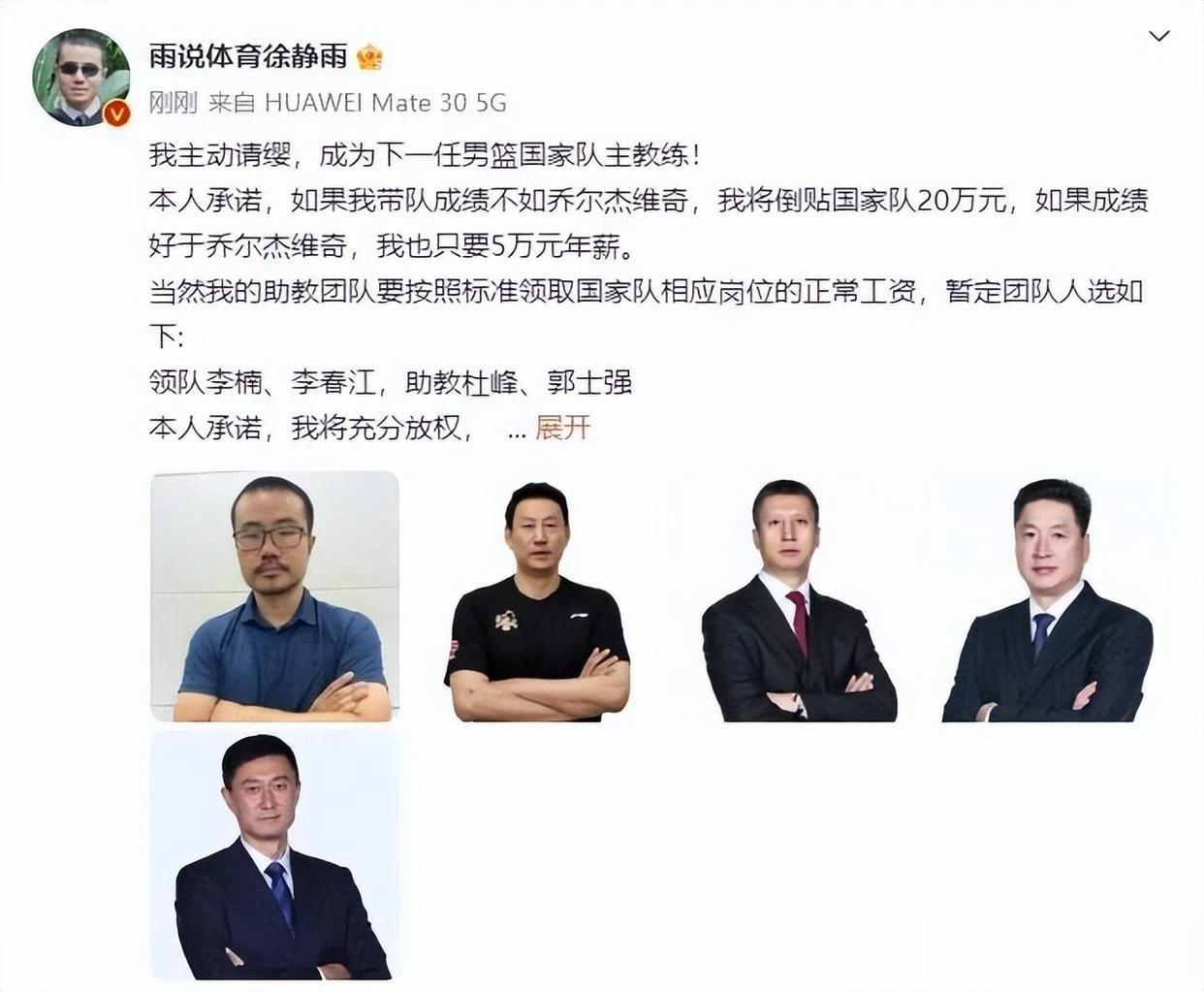 2023男篮世界杯正在如火如荼的进行,昨晚美国击败意大利挺进四强,即将开始半决赛的比赛! 而中国男篮却早已结束了本届男篮世界杯的征程,目前已经就地解散返回国内。本届中国男篮在世界名帅乔尔杰维奇的带领下仅取得1胜4负的成绩,最终无缘巴黎奥运会,并无缘奥运会落选赛资格,创造了历史最差成绩! 针对乔尔杰维奇的用人策略和战术指挥,包括解说员、前男篮球员、联赛教练等纷纷开炮,质疑乔帅! 随着中国男篮传奇球星~易建联的退役,中国男篮正式进入至暗时刻,中国男篮的出路在哪里???没有人知道,似乎又回到了和四年前一样的困局…… 昨日,国内网红篮球自媒体评论员徐静雨,通过录制视频表示,自己愿意主动请缨成为下任男篮主帅。这个消息一出,瞬间登上了热搜榜。 徐静雨承诺若成绩不如乔尔杰维奇,就倒贴国家队20万,若好于乔尔杰维奇只要5万年薪。除此之外,徐静雨还提出了他的助教团队,领队有李楠和李春江,助教有杜峰和郭士强。 针对用人策略和战术指挥,徐静雨表示,他会彻底放权给助教团队,黑锅他来背,这样李春江他们就能无压力发挥聪明才智。 徐静雨的这个表态,乍一听,颇有点故意吸引眼球的炒作嫌疑。也有点拿着爱好挑战别人专业的意思! 果不其然,徐静雨发文后不久,就遭到了媒体人朱彦硕、赵探长、宋翔等人的吐槽…… 球迷朋友们,针对徐静雨的发言,你们怎么看??? 欢迎评论区留言互动~~ 记得关注我哦~[来看我][来看我]