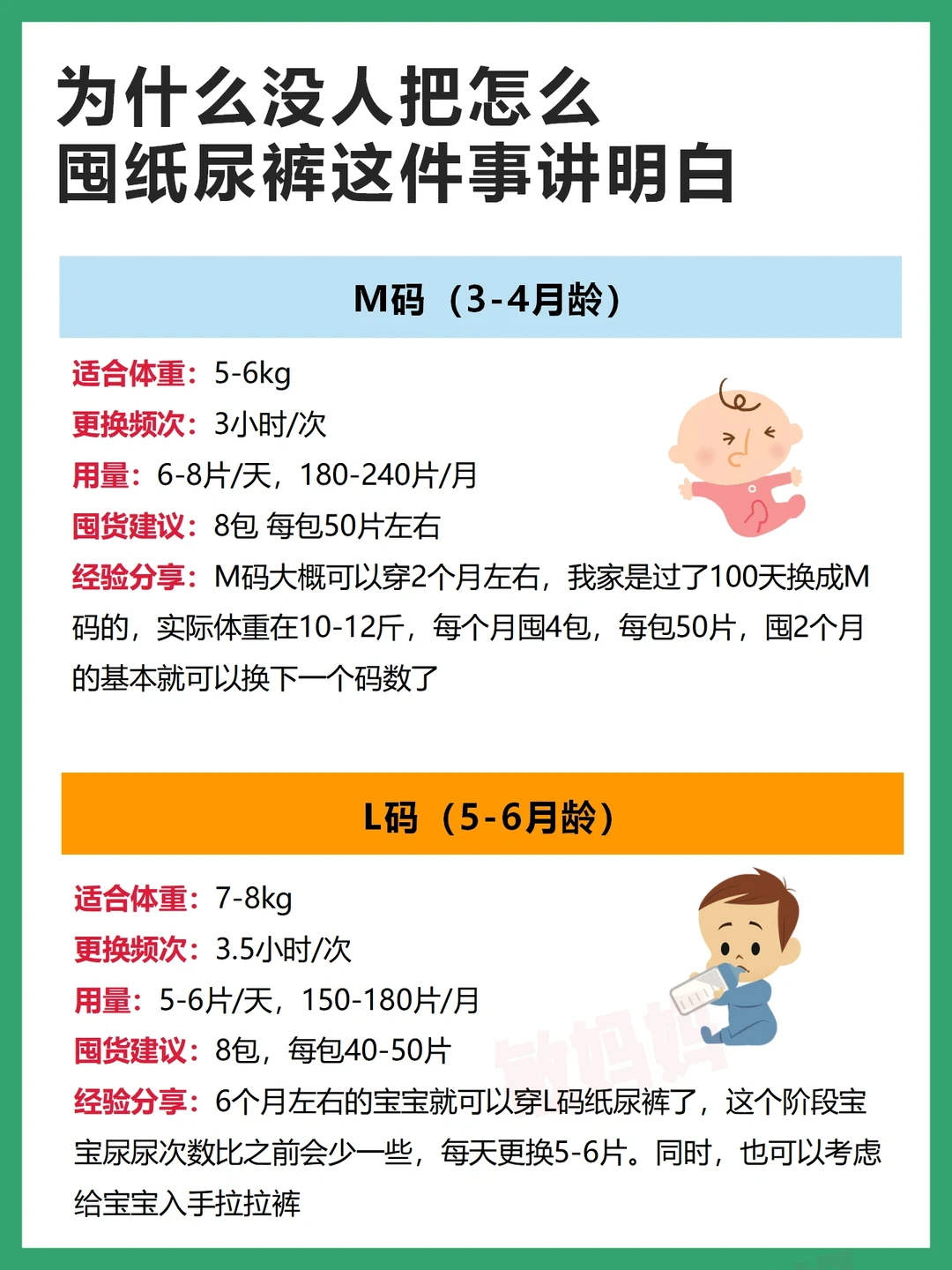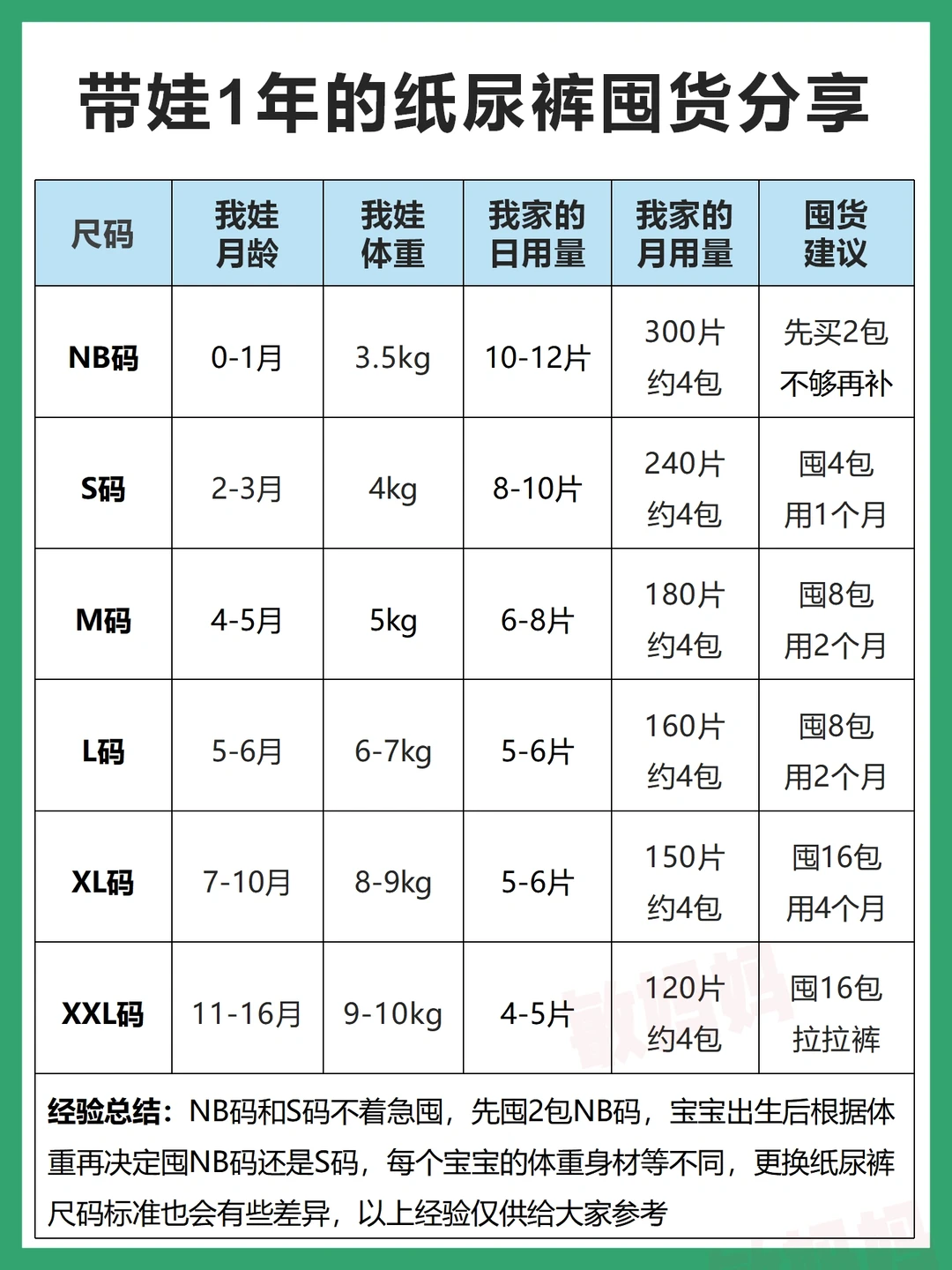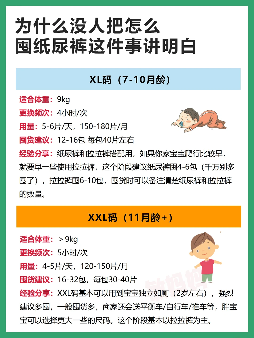 孕晚期准备待产包时,真得是头都大了,纸尿裤怎么囤?囤多少码数的?哪个牌子好用啊?每个码数囤多少?囤多了怕闲置,囤少了怕不够用~现在娃都1岁了,什么月龄穿多大码的纸尿裤,每个尺码怎么囤划算,养过娃后,总算是搞清楚了,这篇分享我👩🏻的纸尿裤囤货经验,供参考~