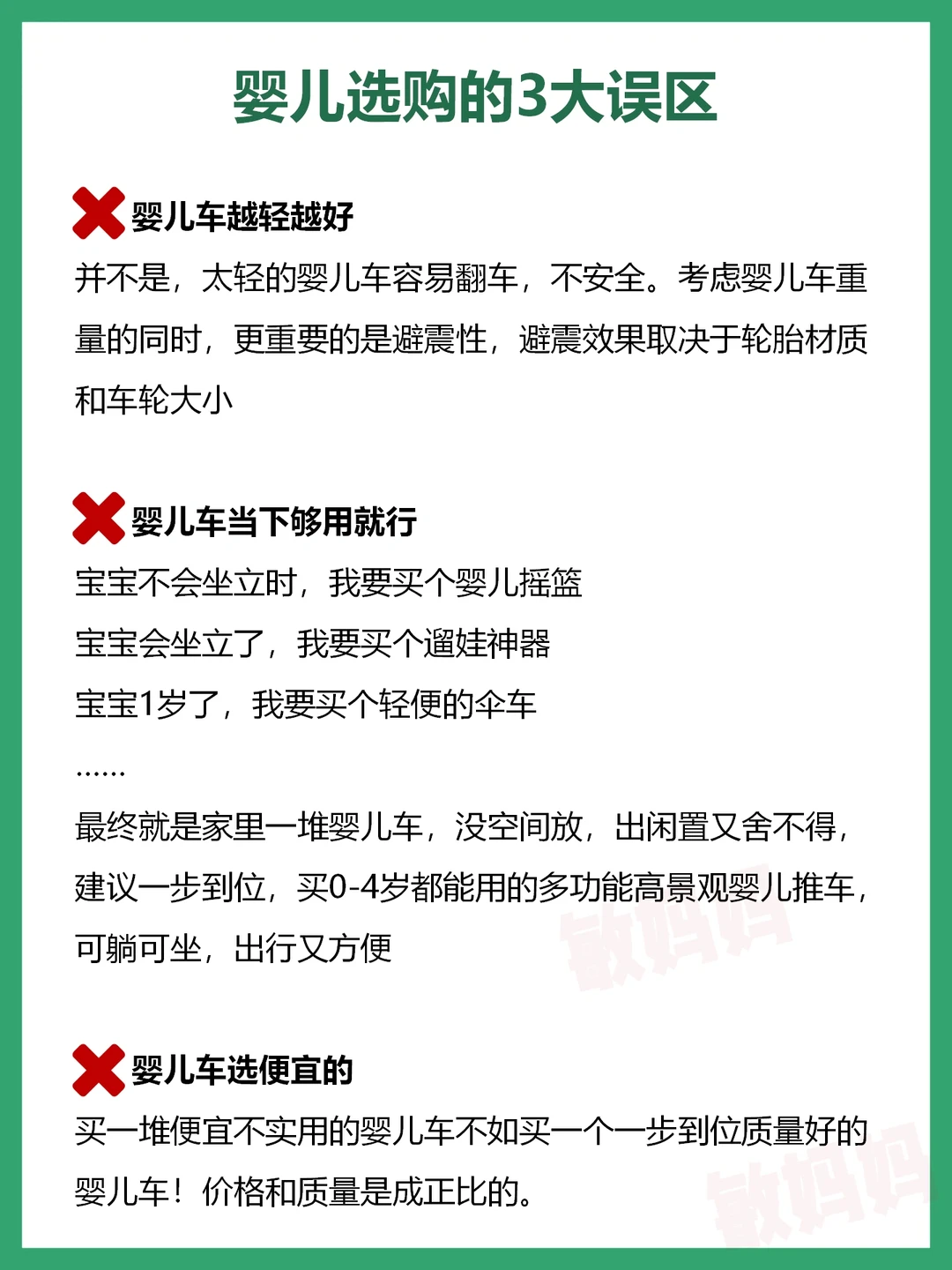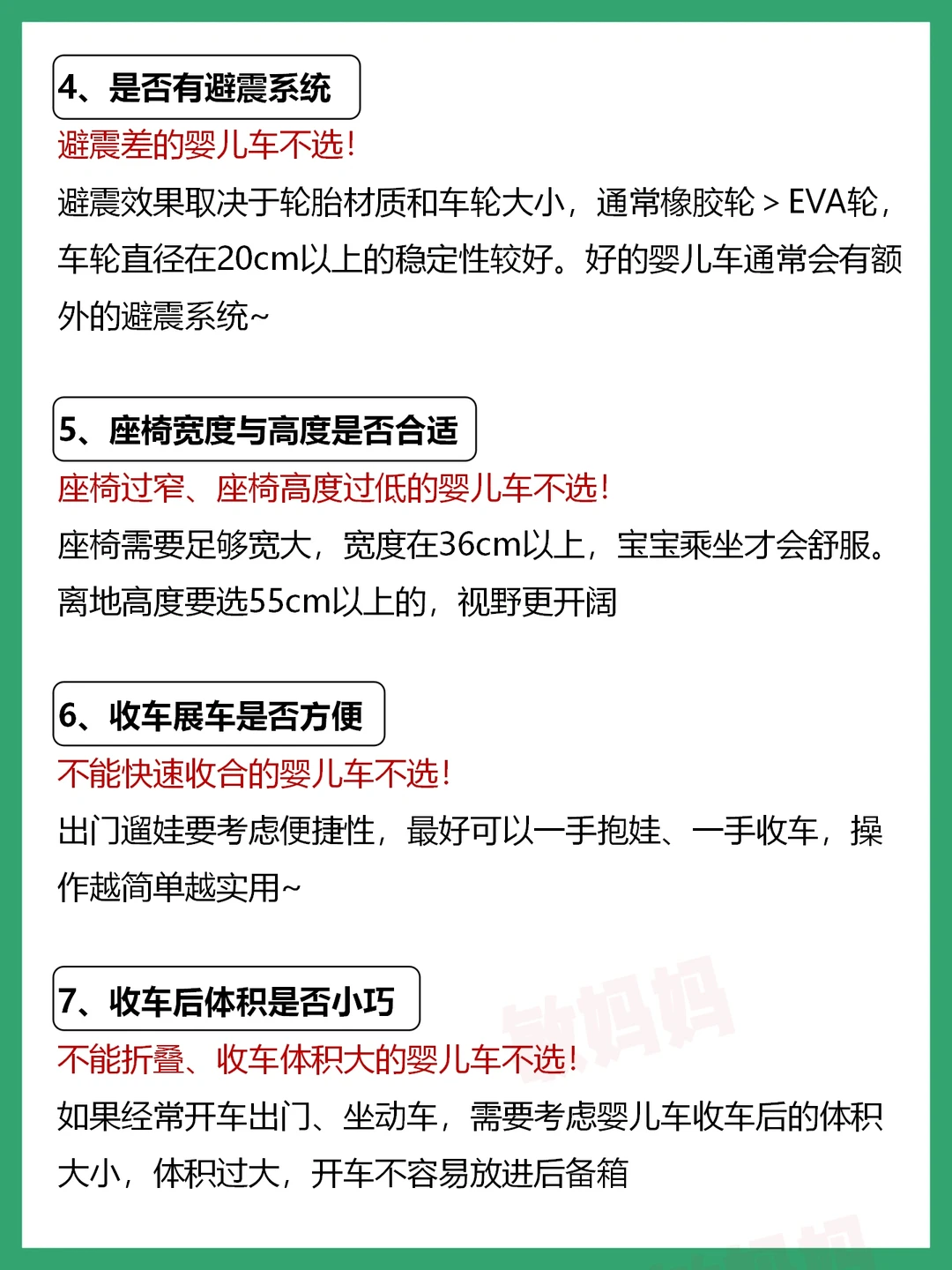 这篇强烈建议新手妈妈看‼️ 真的不要再重蹈我的婴儿车选购之路‼️ . 我家的第一辆婴儿车是孩他爸给准备的,看着是挺好看的,但是太笨重了,而且没有护脊硬靠背只能躺着,将就用到宝宝6月龄,便入手了遛娃神器,那会想着买便宜的就行,结果出门发现只能小区楼下用一下还行,避震和舒适度都差了点。 . 这次翻烂了上的婴儿车攻略,直接买了个0-4岁一步到位的~如果你还不太会选婴儿车,教你这7⃣️步排除法 1⃣️是否有护脊硬靠背 2⃣️是否可调节靠背 3⃣️是否可双向推行 4⃣️是否有避震系统 5⃣️座椅宽度与高度是否合适 6⃣️收车展车是否方便 7⃣️收车后体积是否小巧 . 看完这些,你会选婴儿车了吗?如果你还在纠结,可以考虑下我现在用的巧儿宜finiti婴儿推车,当初选购这辆车车,是看中了它的一体式护脊硬靠背设计,不仅能够支撑宝宝脊椎,而且面料柔软透气,宝宝乘坐也更加舒适安全。 . ✅避震性也比较好,Flex座舱避震系统➕22cm超大耐磨橡胶轮胎➕后轮减震弹簧,即使是过石子路,也不容易颠簸~ . ✅还可以转换正反向推行,小宝宝可以随时和他互动,坐车会更配合,虽然我家宝宝坐稳后才入手的这辆车车,但我👩🏻到现在依然觉得很值,1岁前我家都喜欢反向推行,这样能看到妈妈,1岁后正向推行,宝宝可以更好地看世界。 . ✅扶手高度可调节这个细节也很贴心,我可以根据自己身高调整合适高度,推着宝宝比较舒服,座椅离地高度60cm,高景观,宝宝坐着也会比较舒适,视野开阔~在外头还可以当餐椅用. . ✅一键收展车也非常方便,一个人出去遛娃一手抱娃,一手拎车,完全不在话下。 . 孕晚期准备待产包时,就需要把婴儿车考虑进去了,还没考虑婴儿车的孕妈妈们、新手爸妈们,赶紧行动起来吧
