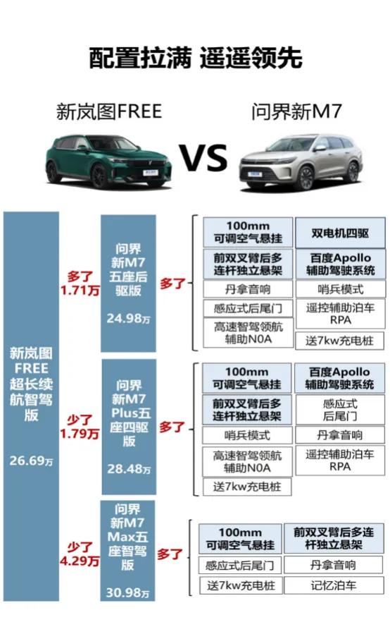 同样以“智”闻名,我觉得新岚图FREE比新问界M7更有诚意,不信的话看我给你拆解。 随着新能源汽车领域的发展,智能化逐渐成为了主机厂和消费者双双关注的焦点。为了提升产品竞争力,在智能化层面,各大主机厂也是不遗余力,比如新岚图FREE和新问界M7在智能化层面的表现就“遥遥领先”。 从硬件来看,新岚图FREE和新问界M7所采用的方案有明显差异,新岚图FREE搭载的百度Apollo Highway Driving Pro领航辅助智驾采用了视觉融合路线,新问界M7配备的的HUAWEI ADS 2.0高阶智能驾驶系统采用了激光雷达的方案,两种方案只能说思路不同,功能上同样优秀。 不过在现阶段,新岚图FREE的表现还是要比新问界M7优秀一些,比如其在高速上的自主变道成功率就大于99%,平均百公里接管次数小于1次,进出匝道场景成功率大于95%...... 更重要的是,26.69万的新岚图FREE限时选装百度Apollo Highway Driving Pro领航辅助智驾系统只需要10000元,也就是相当于27.69万就可以买到一辆拥有高阶智驾功能的中大型新能源SUV。而搭配HUAWEI ADS 2.0高阶智能驾驶系统的新问界M7则要30.98万,对比之下,你觉得谁更有诚意?#岚图FREE#