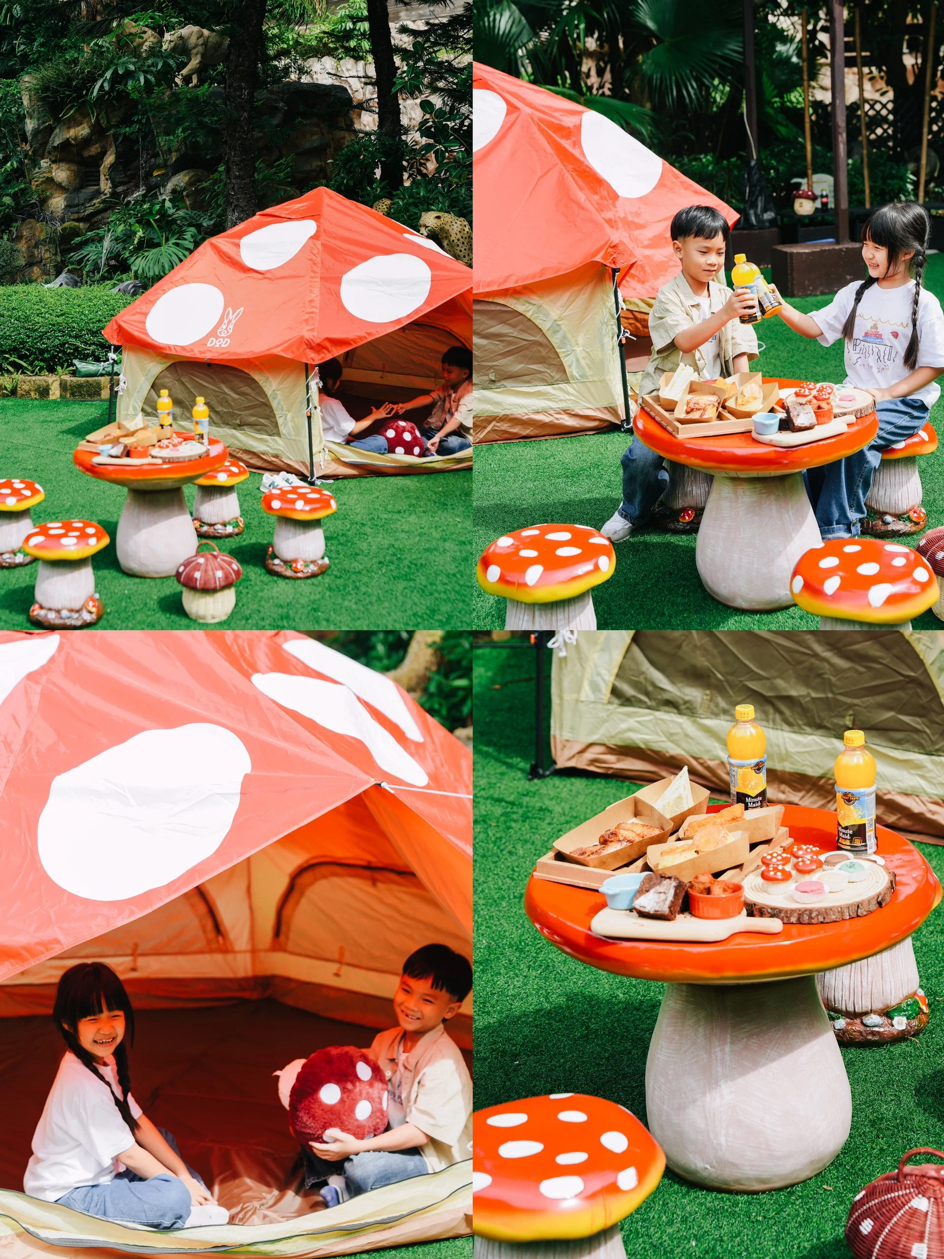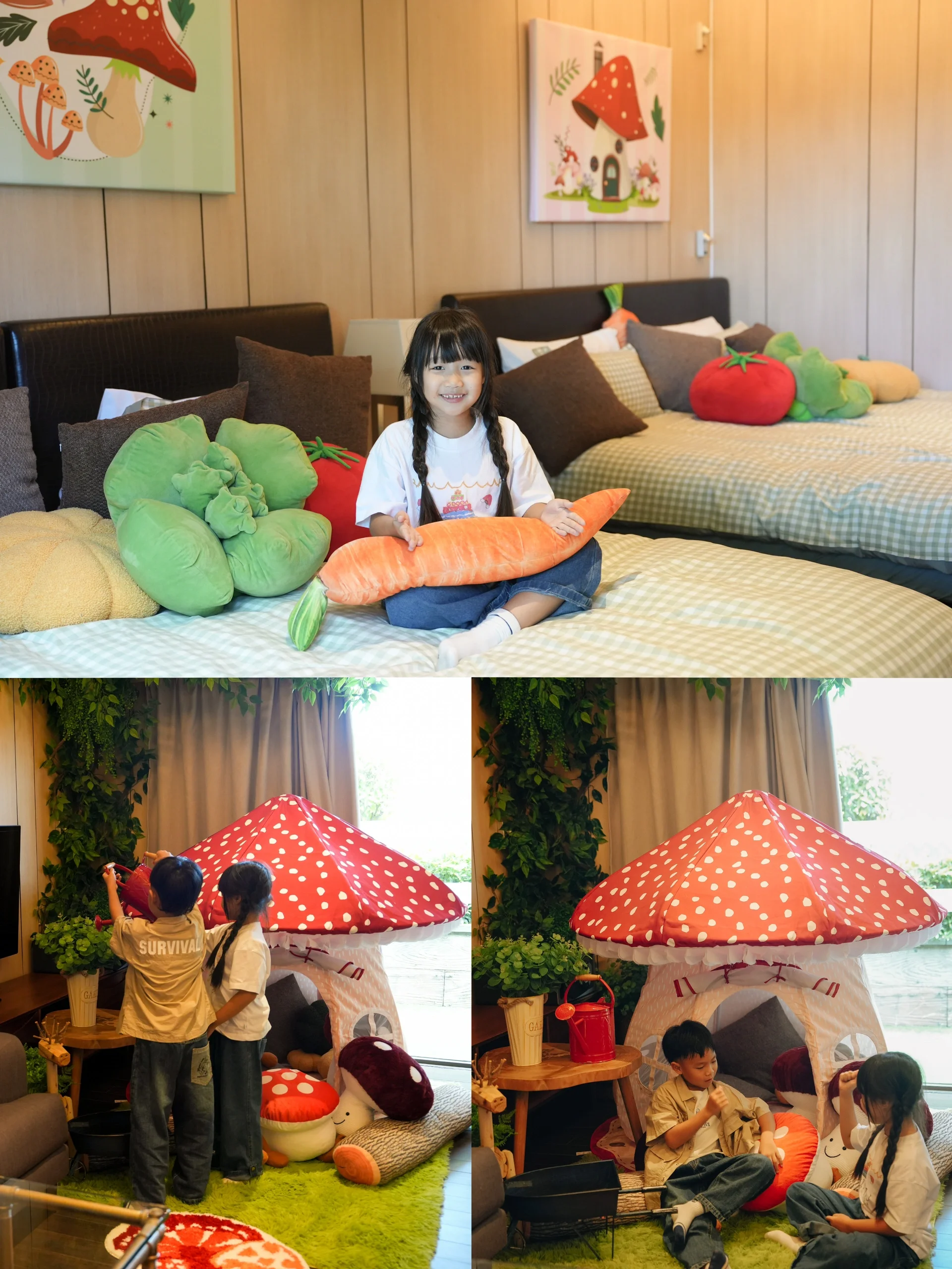 我们入住蘑菇森林乐主題客房,打开房门就看到超可爱的蘑菇帐篷及各种蘑菇装饰🍄,设2张大床,足够一家四口入住