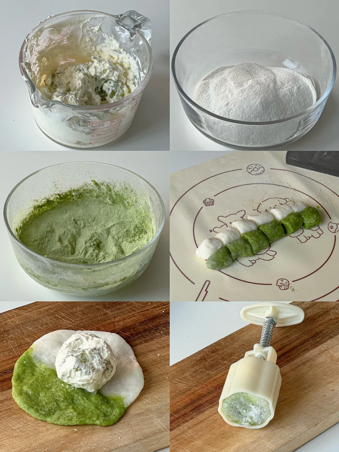 姐妹们中秋快乐吖~ 有手就会的冰皮月饼安排一下hh 这糯叽叽的口感谁顶得住啊😭 · 🧾食材: 预拌粉180g、开水180g、奶油奶酪160g、青提果肉、抹茶粉2g 👩🏻🍳做法: ❶青提果肉加奶酪奶酪拌匀 ❷预拌粉分成两份,一份加抹茶粉拌匀 ❸分别加入90g开水揉成团 ❹搓成长条,分割成六份 ❺放入内陷包紧 ❻粘一点熟糯米粉放入磨具压实脱模即可