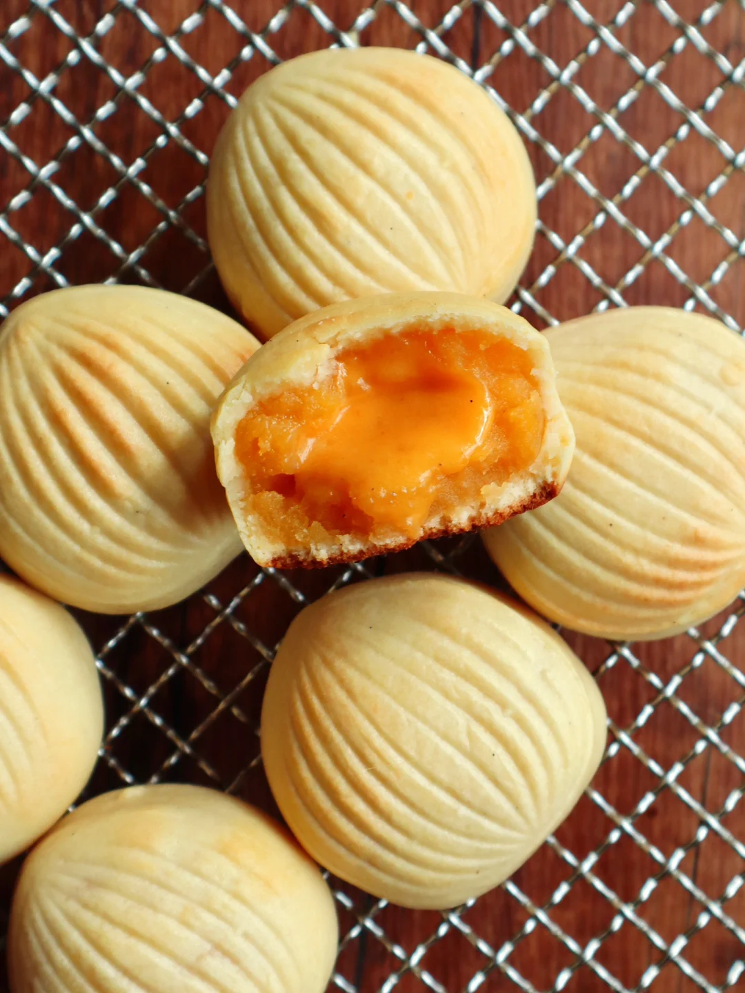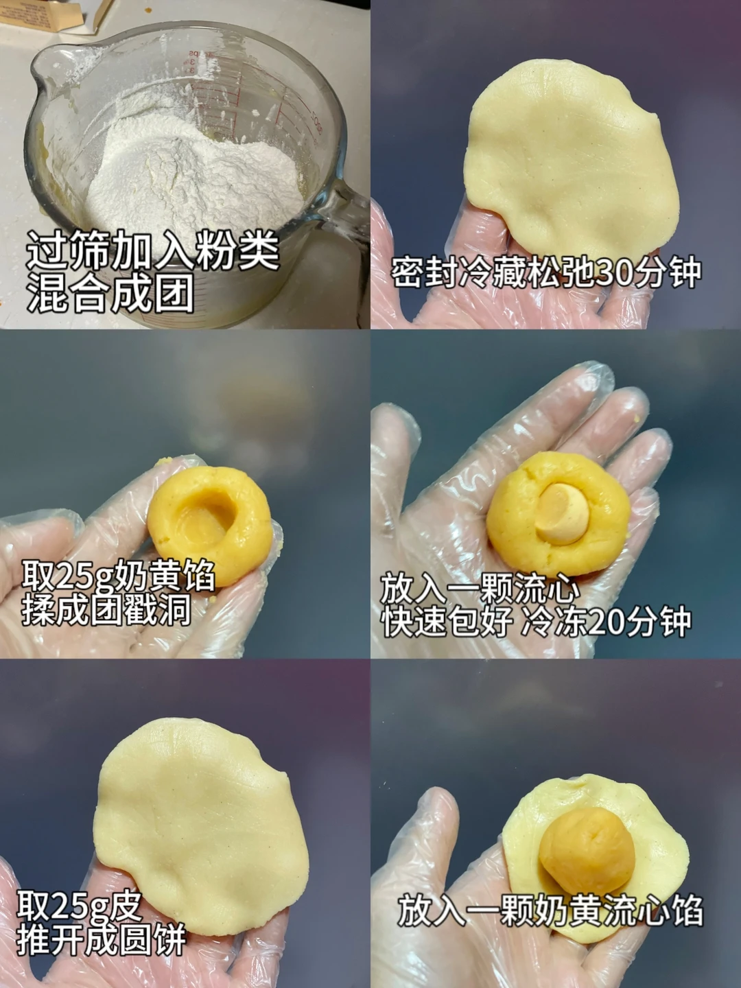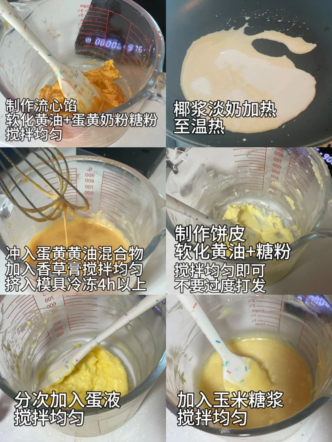 🥣流心馅:咸蛋黄2-3个|椰浆15g|黑白淡奶15g|糖粉20g|软化黄油10g|奶粉5g|香草膏5g|黄金芝士粉2-3g