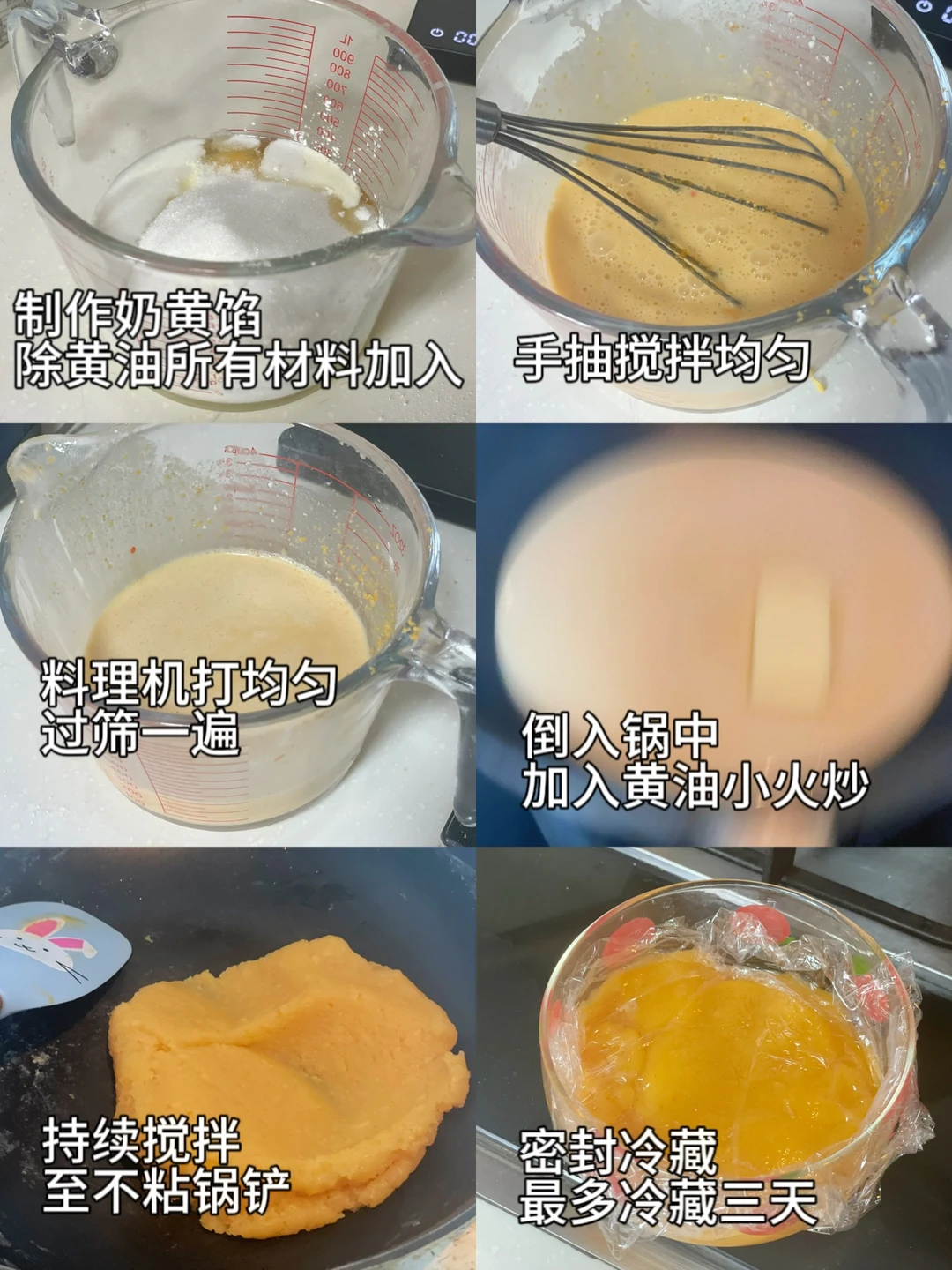 📎奶黄馅冷藏保存三天,炒时会先产生小疙瘩,不用管继续炒,用刮刀碾压,要小火否则会糊,离火用余温继续炒,不要炒过会出油