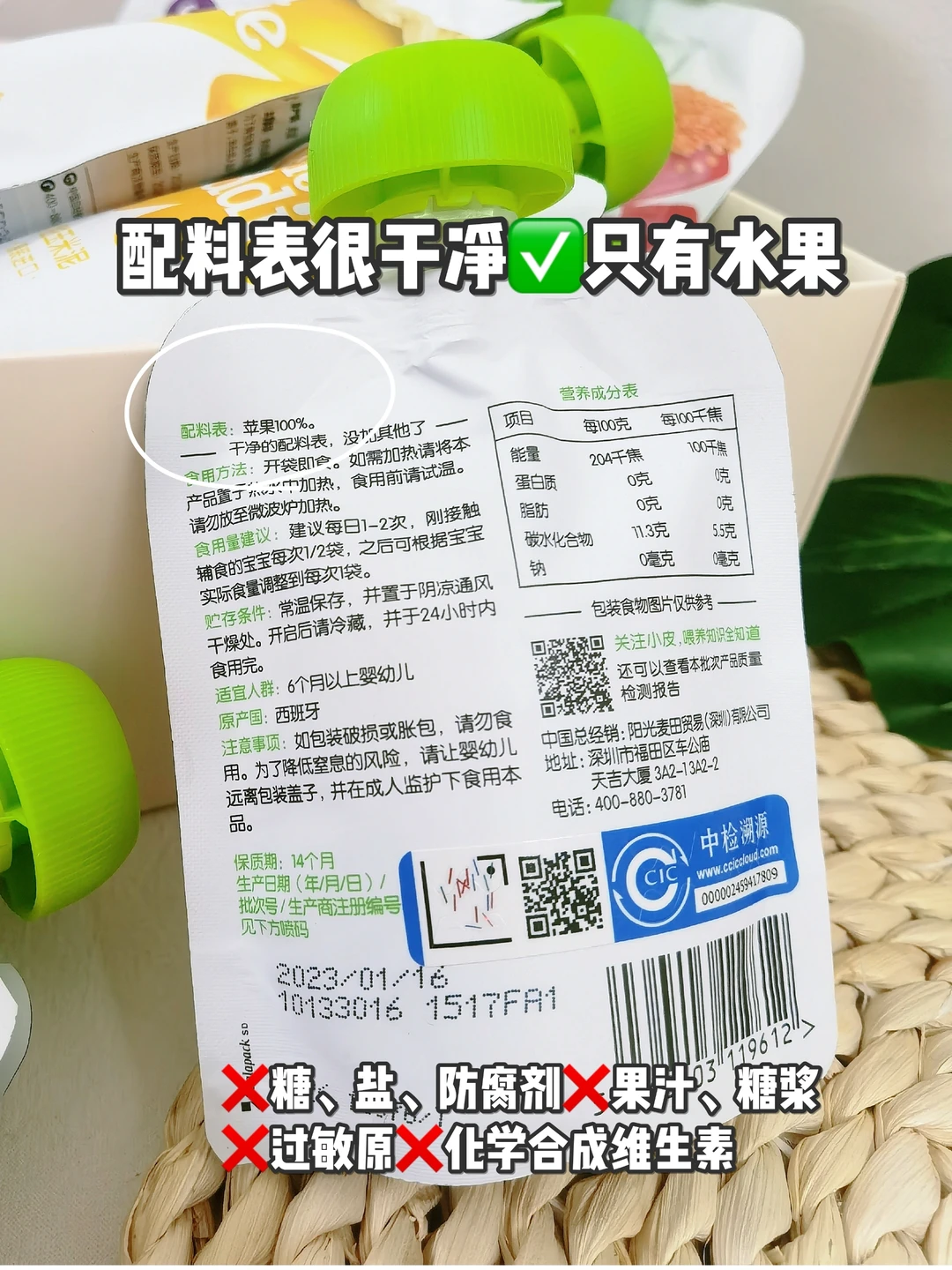 ——看配料表是否纯果泥,不添加防腐剂,不含白砂糖、食用盐、食用香精、着色剂,特别要关注是否含有过敏原,排除过敏风险