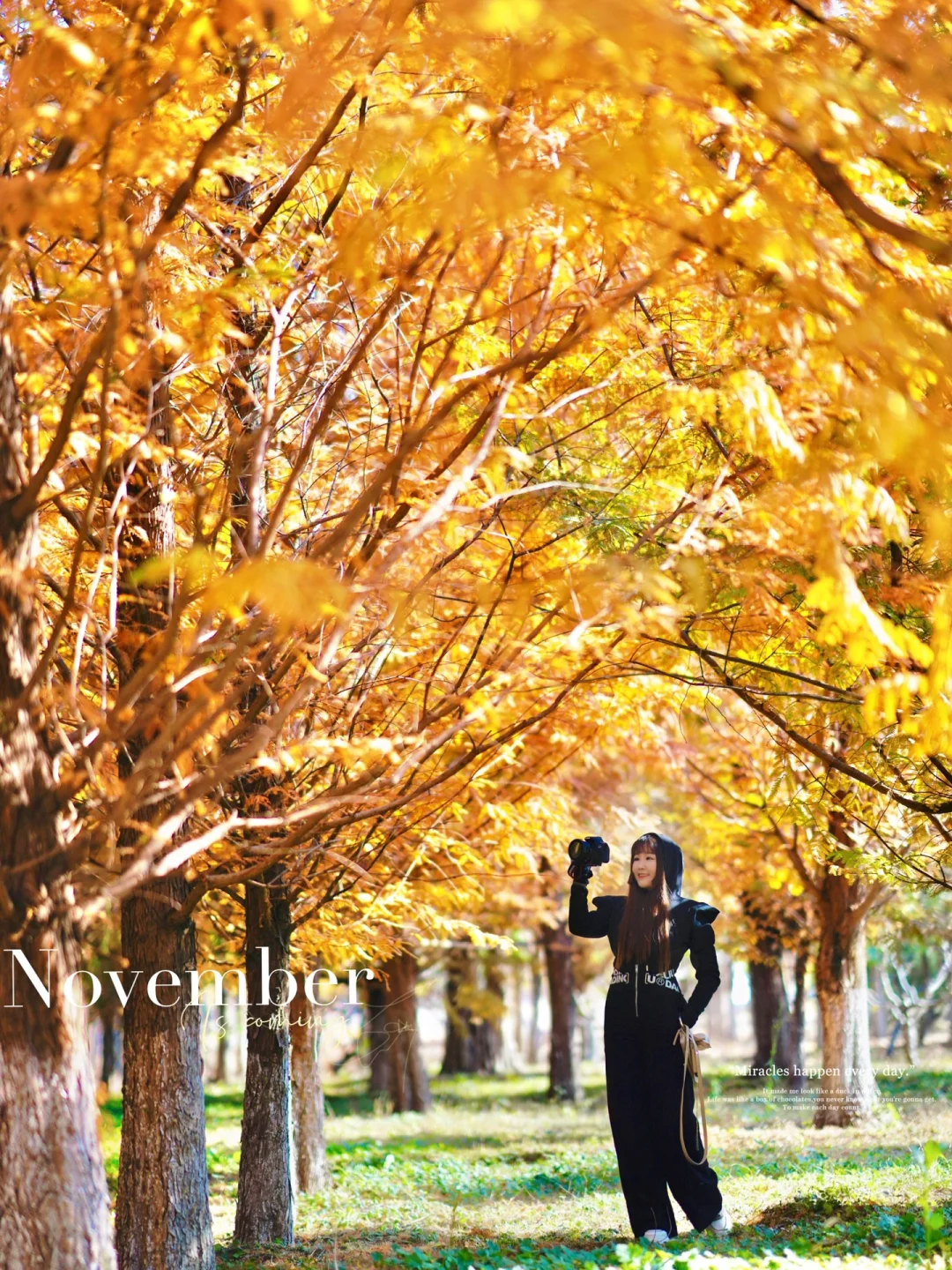 🟠轻徒步路线:从厕所顺马路直走,第1️⃣个路口左手是红杉树,马路对面是银杏林,穿过红杉树是西郊线小火车,穿过火车道进入小公园,徒步横穿小公园,往左走又是一大片银杏林