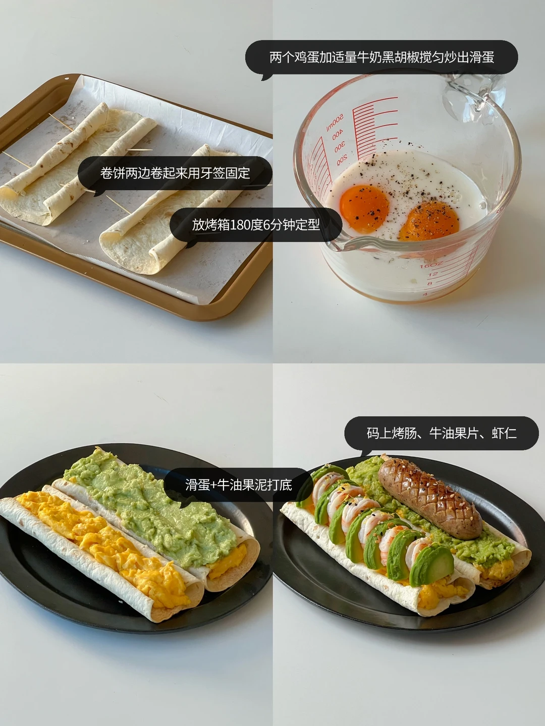 全麦饼这个吃法真的好爱 烤箱烤的脆脆的 搭配上牛油果🥑虾仁🍤烤肠 好吃又健康还不会月半 · 🧾食材: 全麦饼、鸡蛋🥚、牛奶🥛、牛油果🥑、虾仁🍤、烤肠 👩🏻🍳做法: ❶卷饼两边卷起来用牙签固定 ❷放烤箱180度6分钟定型 ❸两个鸡蛋加适量牛奶黑胡椒搅匀炒出滑蛋 ❹牛油果加柠檬汁黑胡椒压成泥 ❺虾仁、烤肠煎熟 ❻滑蛋牛油果打底,码上虾仁、牛油果、烤肠即可