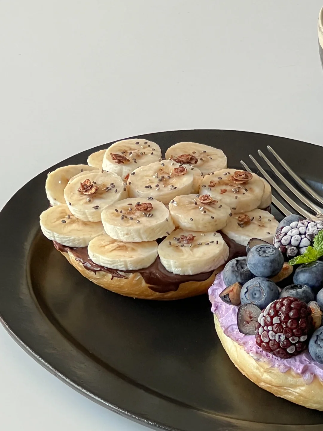 高颜值双拼hin难不爱🙌🏻 今天有点馋甜食 就安排上了甜口双拼嘻嘻 奶油奶酪加自己熬的蓝莓果酱 可以搭配各种🍞🥯~ · 🧾食材: 贝果🥯、巧克力酱🍫、奶油奶酪、蓝莓🫐、黑树莓、香蕉🍌、奇亚籽、麦片、薄荷 👩🏻🍳做法: ❶贝果对半切开,表面喷水,空气炸锅复热 ❷涂抹上巧克力酱和蓝莓奶油奶酪 ❸码上香蕉片、麦片、奇亚籽,蓝莓、黑树莓、薄荷叶