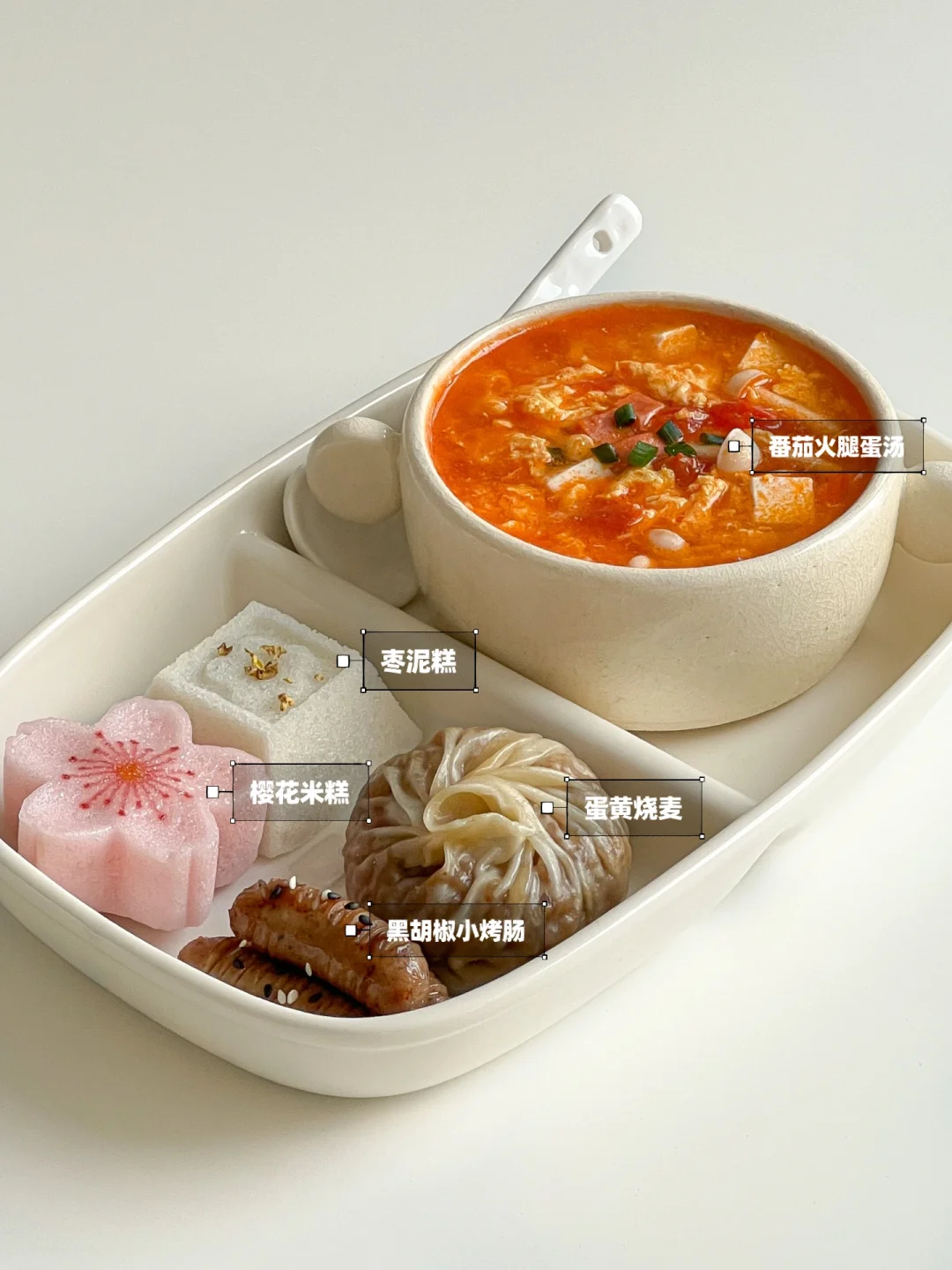 整理了近期做的早餐 中式早餐也可以丰富精致 吃出幸福感鸭~ 宝子们再忙也要记得好好吃饭认真生活🤍 · ❶鸡汤面+纸皮烧麦+枣泥糕+黑胡椒烤肠+溏心蛋 ❷番茄火腿蛋汤+樱花米糕+蛋黄烧麦+枣泥糕+黑胡椒小烤肠 ❸南瓜米糊+三鲜蒸饺+米糕+溏心蛋+黑胡椒烤肠 ❹全麦吐司版肉松小贝+坚果酸奶碗