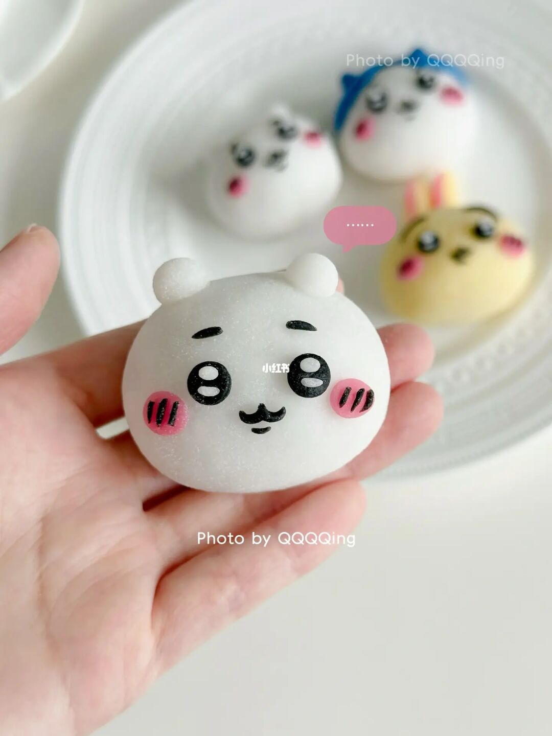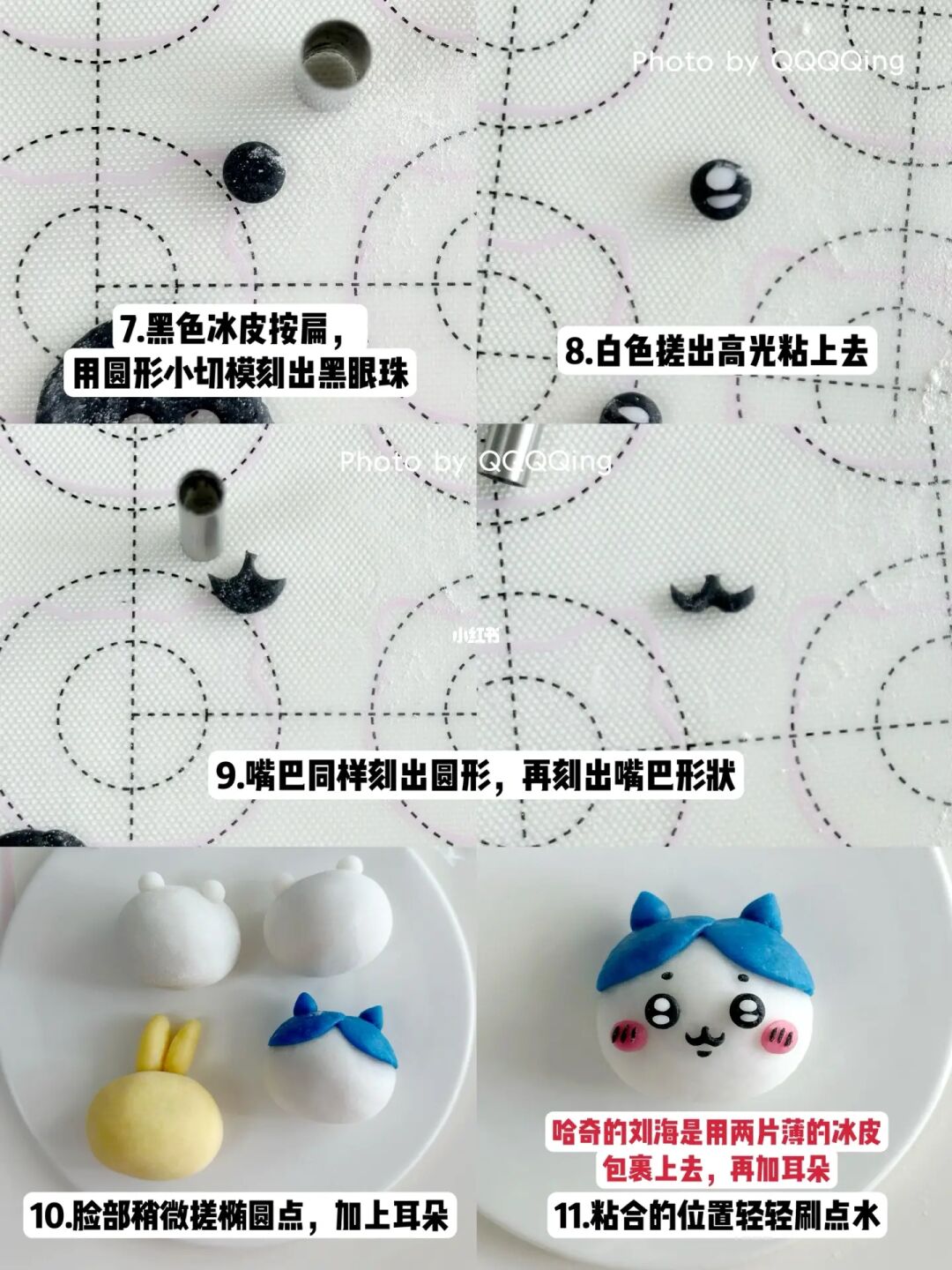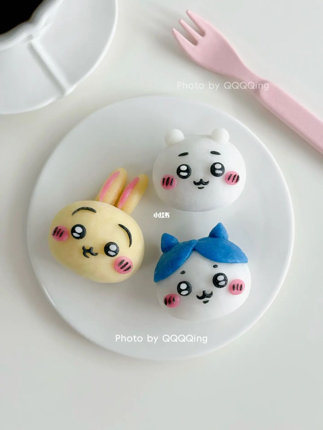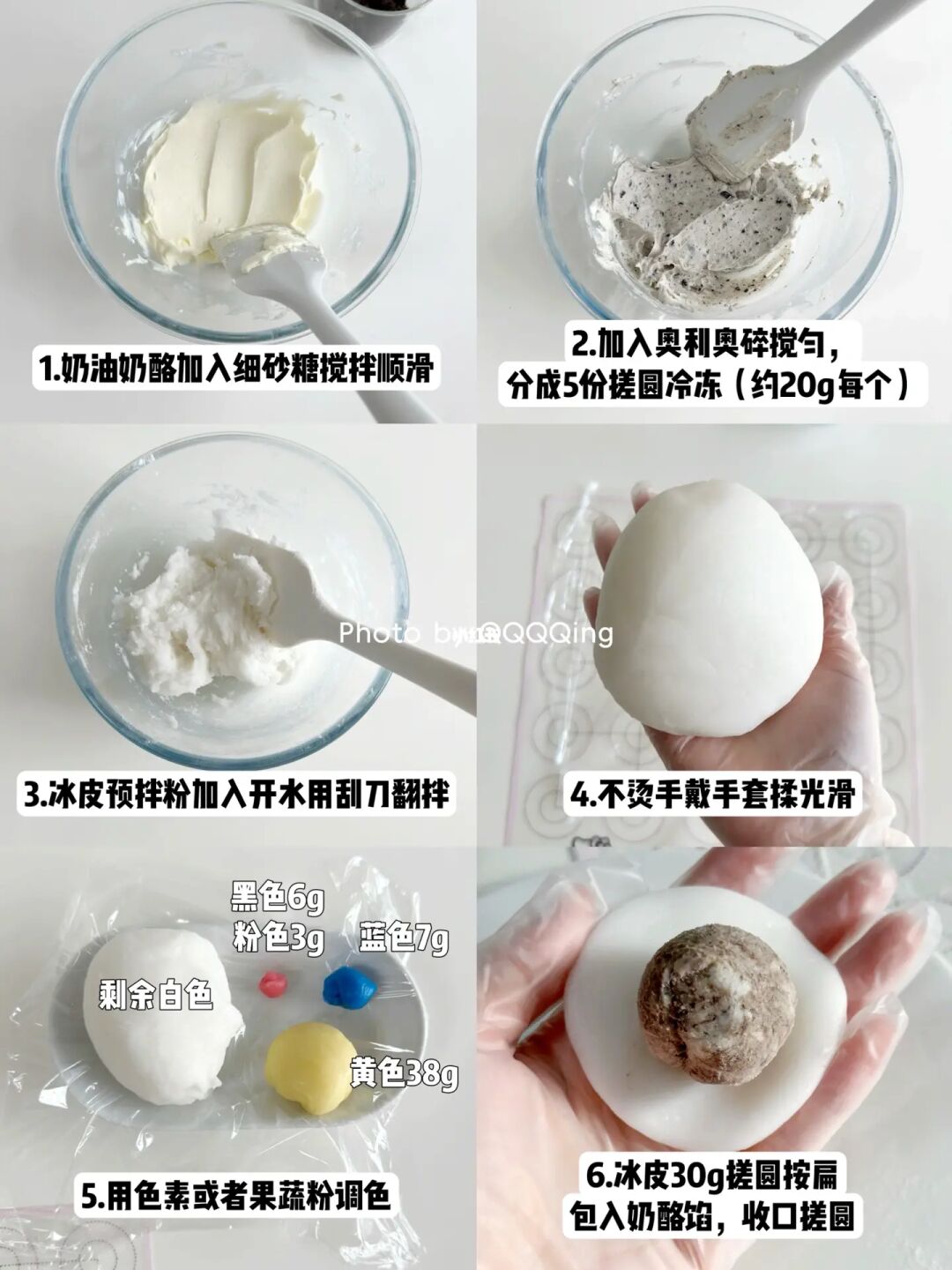 🌕中秋快到啦~ 今天来分享Chiikawa三只小可爱的月饼做法, 喜欢的不要错过,一起试试吧[喝奶茶R][喝奶茶R] - 🥮材料(大约做5个): 奶油奶酪100g 细砂糖12g 奥利奥碎8g - 冰皮预拌粉100g 开水100g - 熟糯米粉适量 - 🎨调色(一只乌萨奇,一只哈奇,三只吉伊): 黄色38g 蓝色7g 粉色3g 黑色6g 其余白色 - 奶酪馅分5个,20g每个(搓圆冷冻) 冰皮30g每个 - Tips: 糯米粉要炒熟做手粉防粘,还有戴烘焙手套,不然会粘的怀疑人生。 -