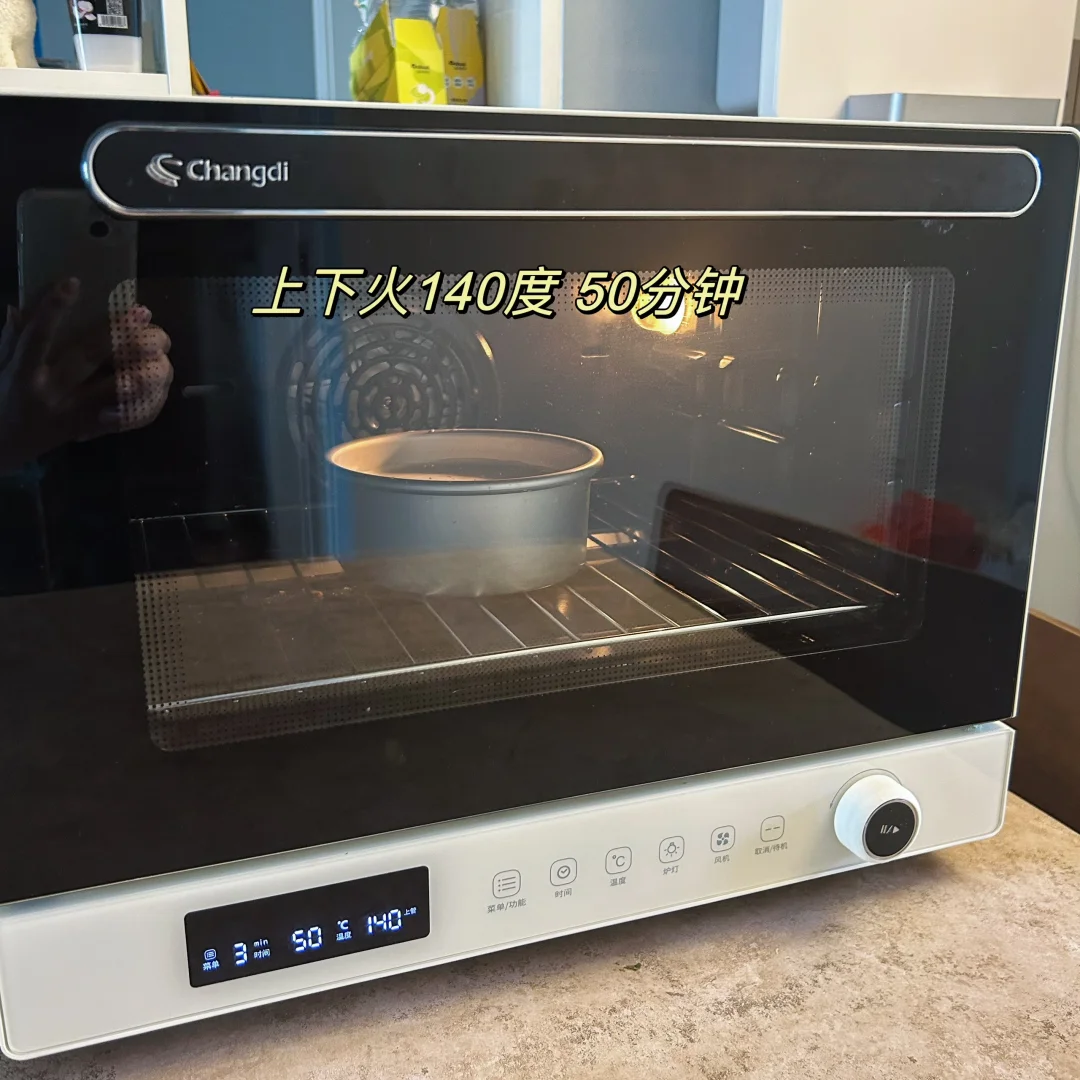 5️⃣翻拌好的面糊从高处倒入模具内,七八分满即可,不然会出现蘑菇顶,轻震两下模具震出气泡,或者不震用牙签划两下划走气泡,放入提前预热好的烤箱下层,上下管140度烤50分钟,同款烤箱可参考这个温度,出炉后震两下震出热气,倒扣晾凉,完全晾凉后再进行脱模。