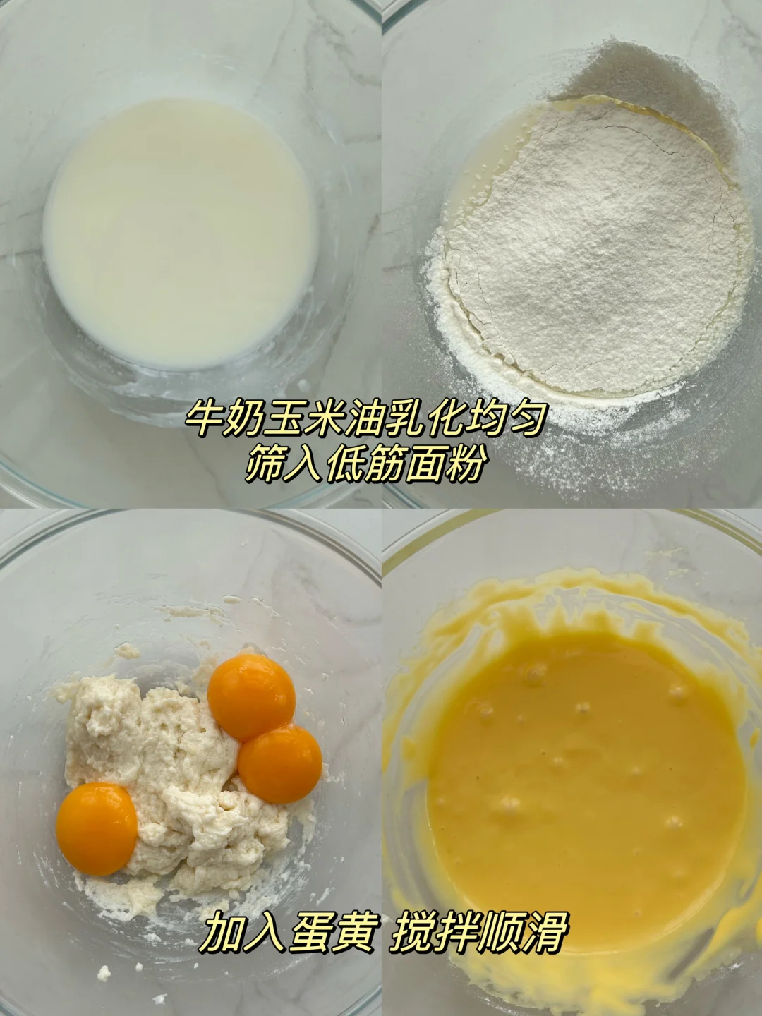 1.牛奶加玉米油搅拌至酸奶状。筛入低筋面粉搅拌至无干粉,加入蛋黄搅拌顺滑。