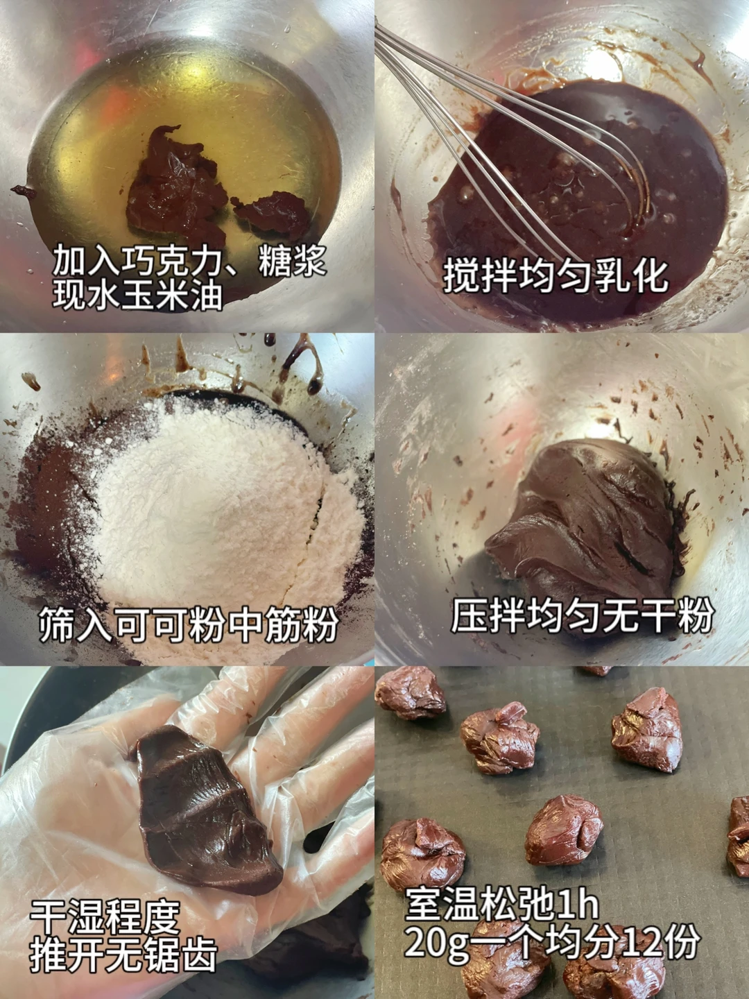 2⃣加入可可粉中筋面粉,搅拌均匀;检查面皮干湿状态应按扁边缘无锯齿。保鲜膜覆盖包裹室温松驰1-2h