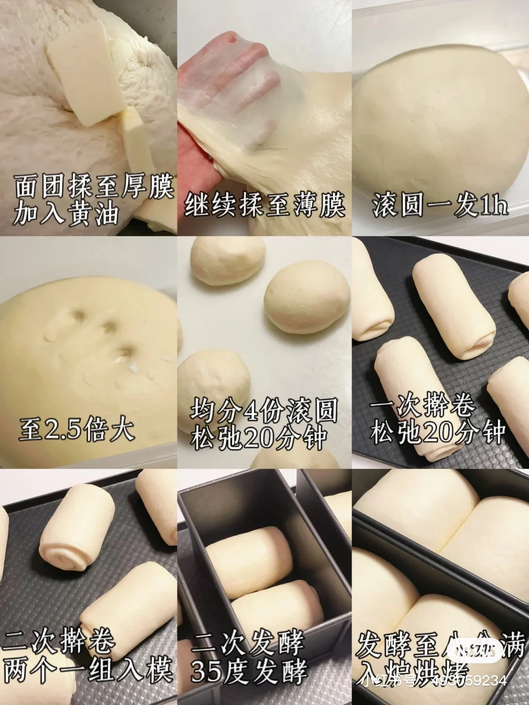 4⃣️一次擀卷,松弛20分钟;2次擀卷,2个一组入模。35度/80湿度二发至九分满