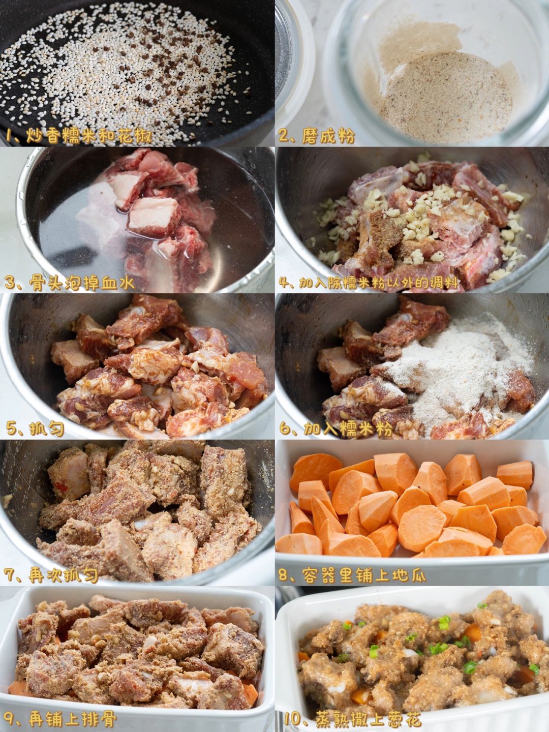 6⃣️抓粉的排骨铺在地瓜上,放入蒸箱蒸30分钟就可以吃啦。