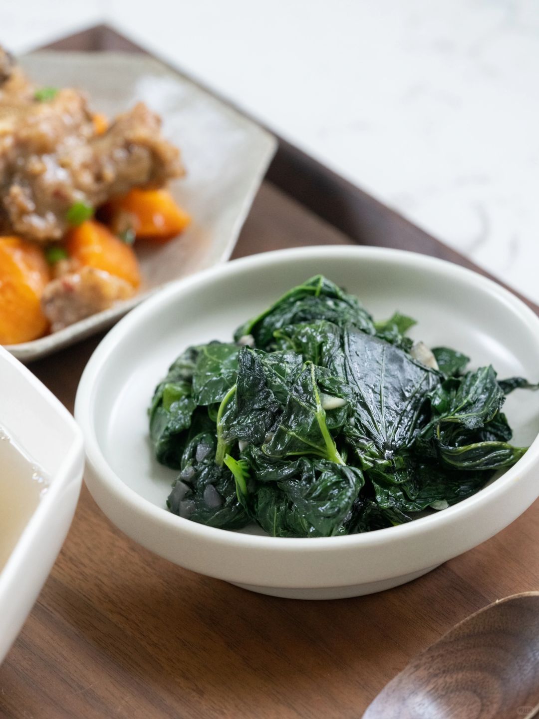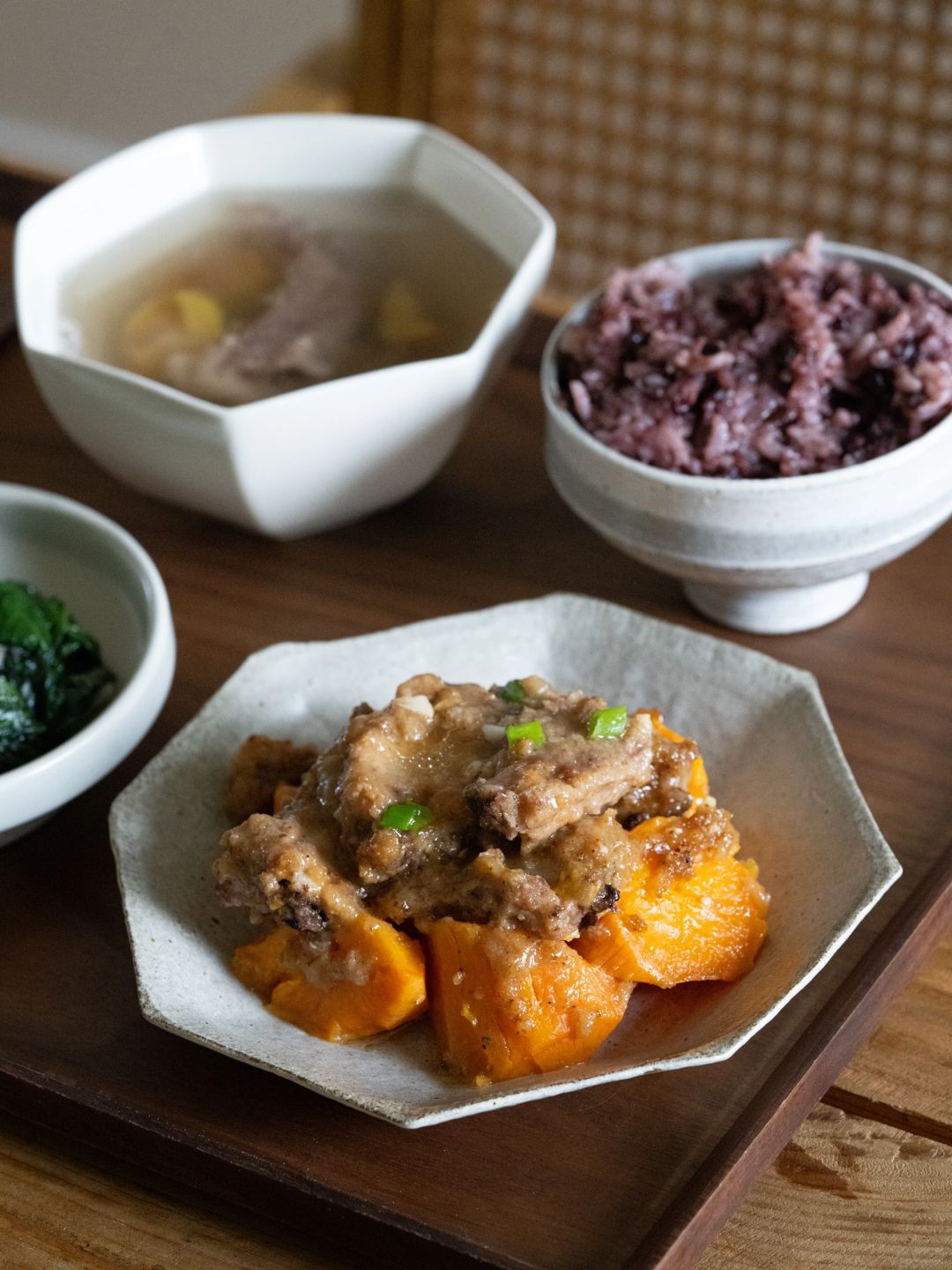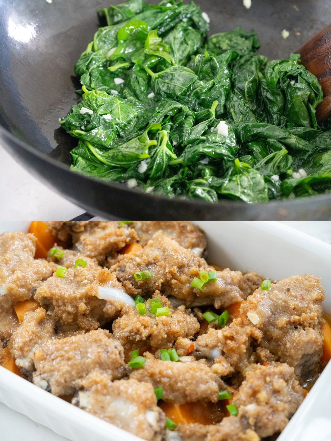 午餐:粉蒸排骨➕炒地瓜叶➕板栗汤➕紫米饭。