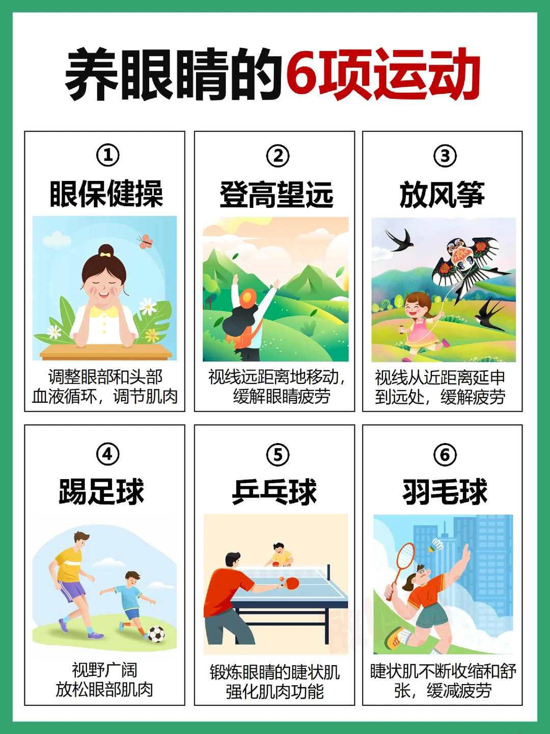 这里总结的伤害眼睛的一些行为就不要做了,平时在课外或者下班后要多做眼保健操、登高远望、放风筝、踢足球、乒乓球、羽毛球这6项运动