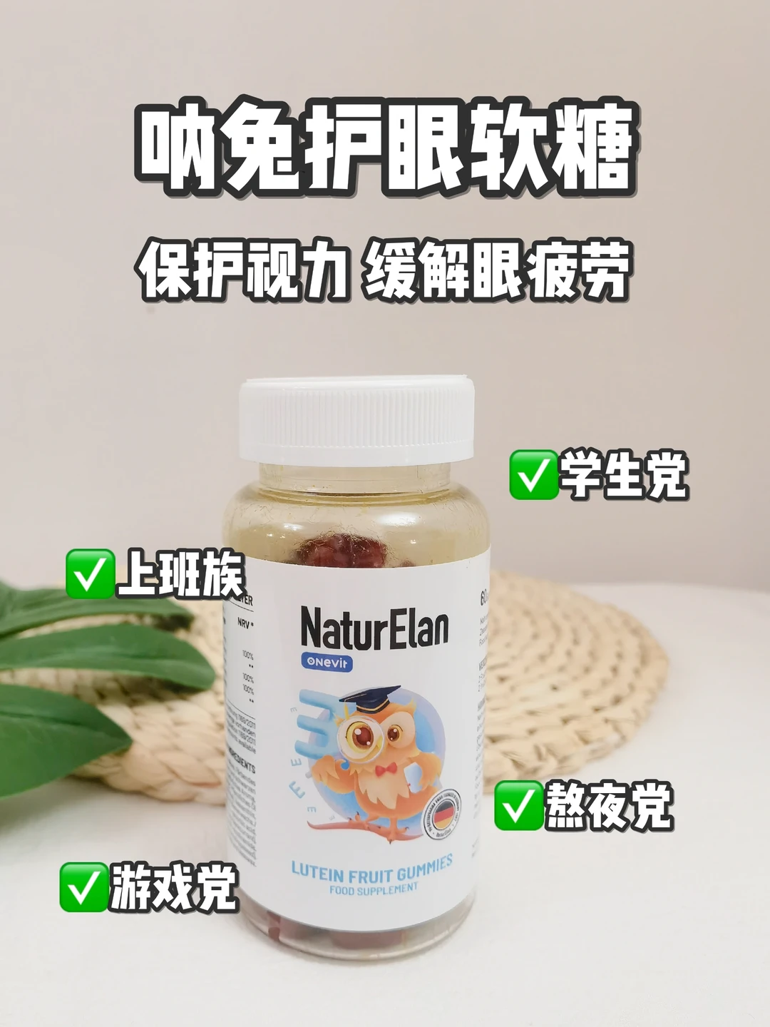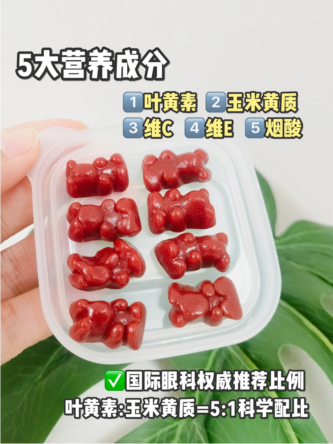 呐兔护眼软糖采用了国际眼科权威推荐配方,叶黄素:玉米黄质科学配比5⃣:1⃣,同时搭配维生素C➕维生素E➕烟酸,5大营养成分,满满保护力~