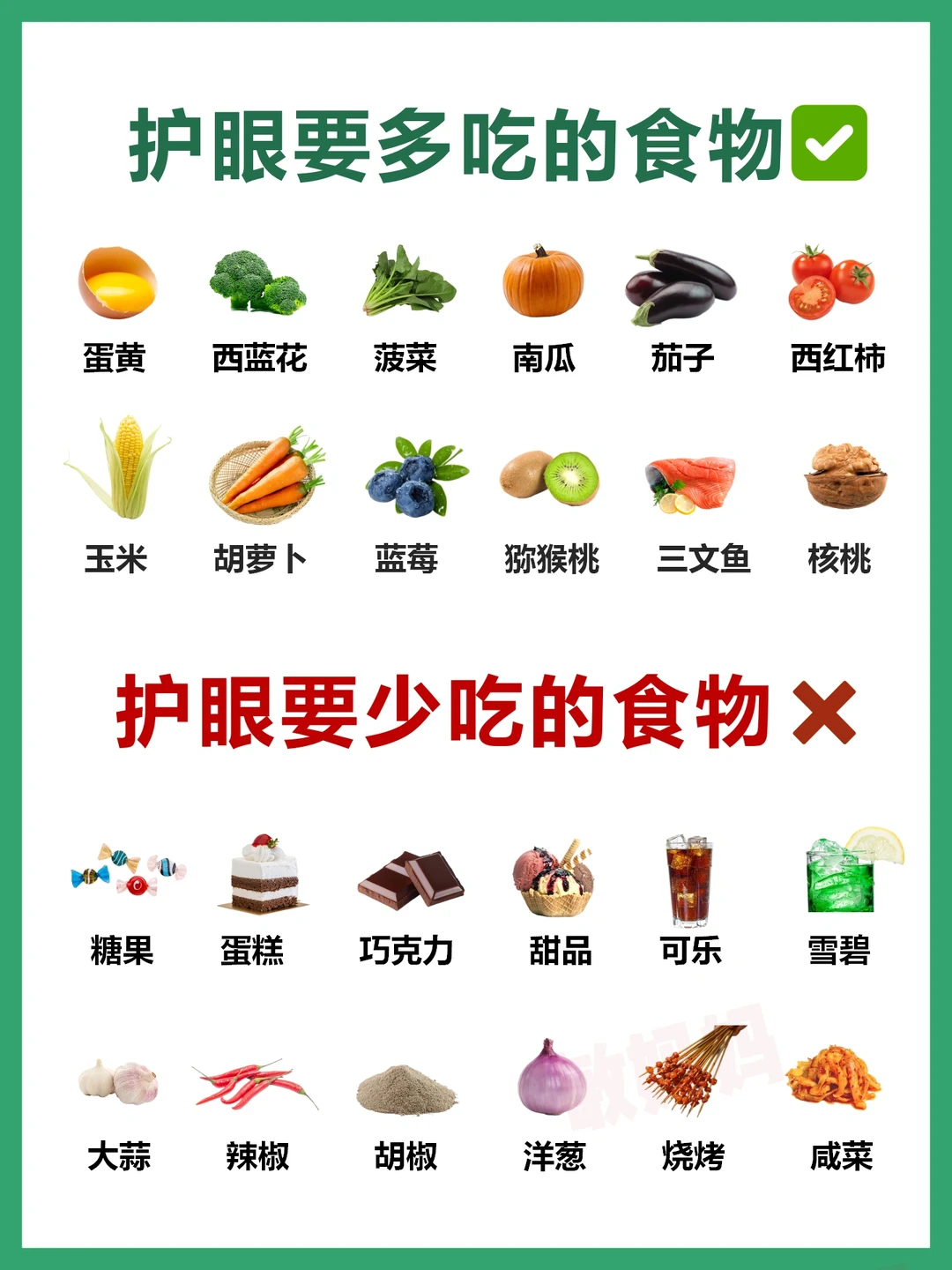 在饮食方面,糖果、蛋糕、巧克力、甜品、可乐、雪碧、大蒜、辣椒、胡椒、洋葱、烧烤、咸菜等食品要控制尽量少摄入、不摄入❌,多吃叶黄素、玉米黄质、维生素E、维生素C含量高的食物,如蛋黄、西蓝花、玉米、胡萝卜、三文鱼等✅但是常规食补叶黄素的含量并不能满足身体所需,还是需要额外补充内服调理