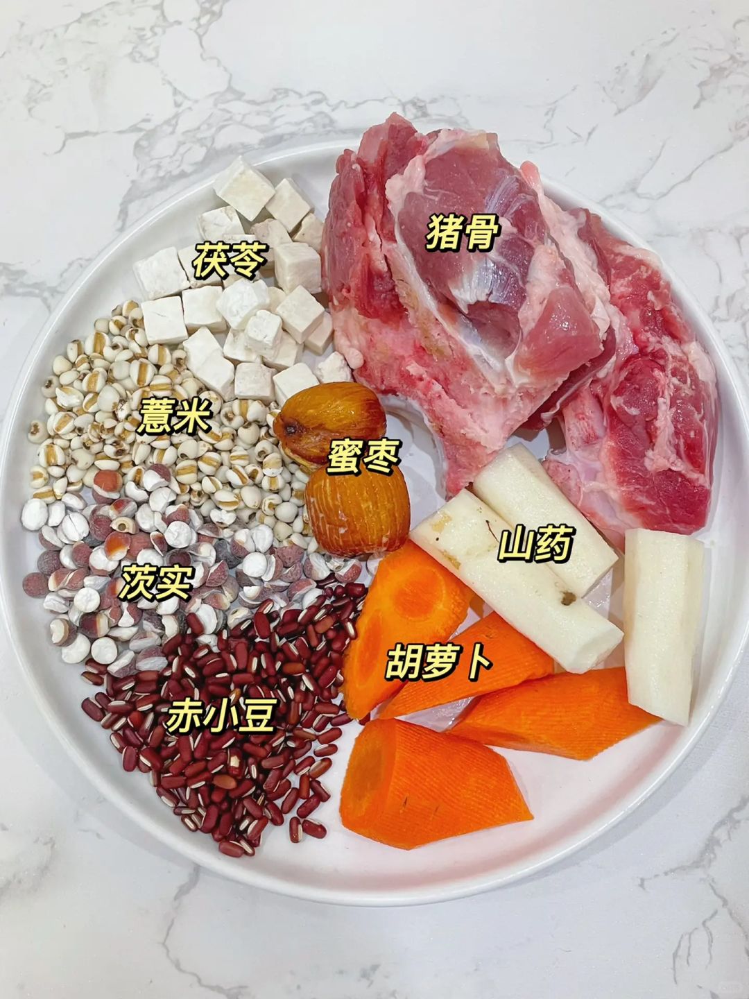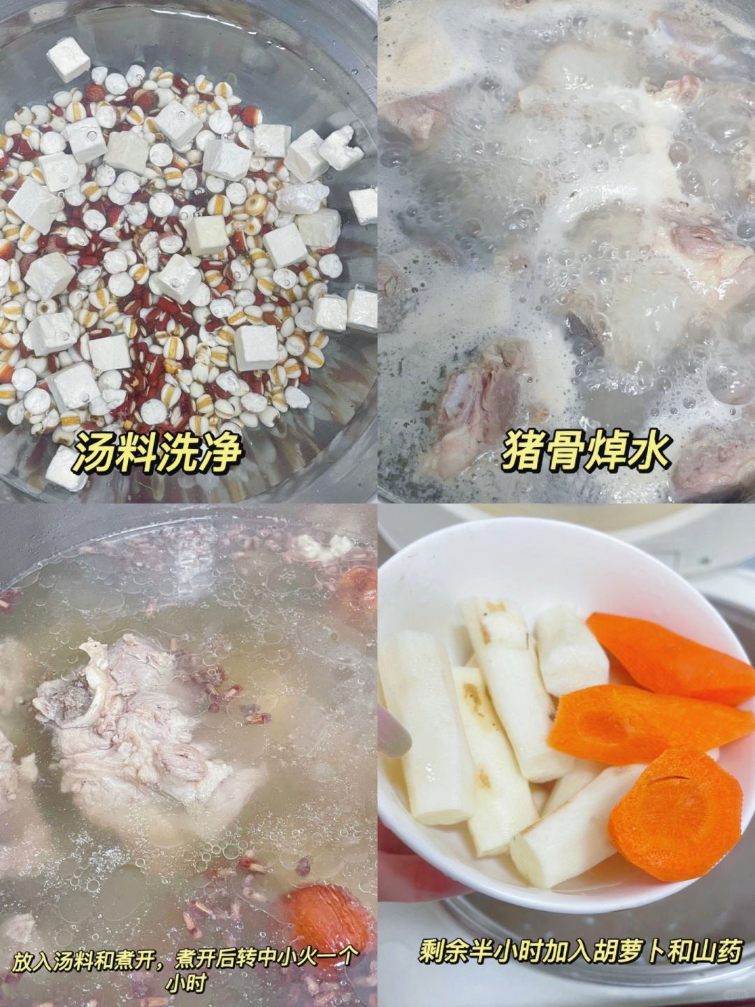 ⭐️材料:茯苓、薏米、茨实、赤小豆、蜜枣、猪骨/排骨/瘦肉、新鲜山药/山药片、胡萝卜