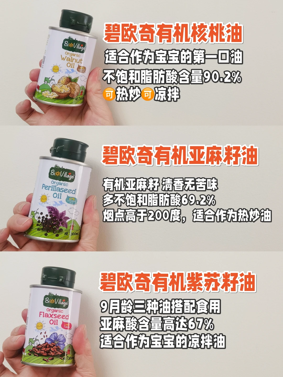 关于辅食油,我给宝宝👧🏻选的是碧欧奇有机辅食油三件套,刚开始是想入手核桃油来着,做了很多攻略,很多妈妈都说核桃油、亚麻籽油、紫苏籽油三种辅食油搭配营养更均衡,果断剁手!