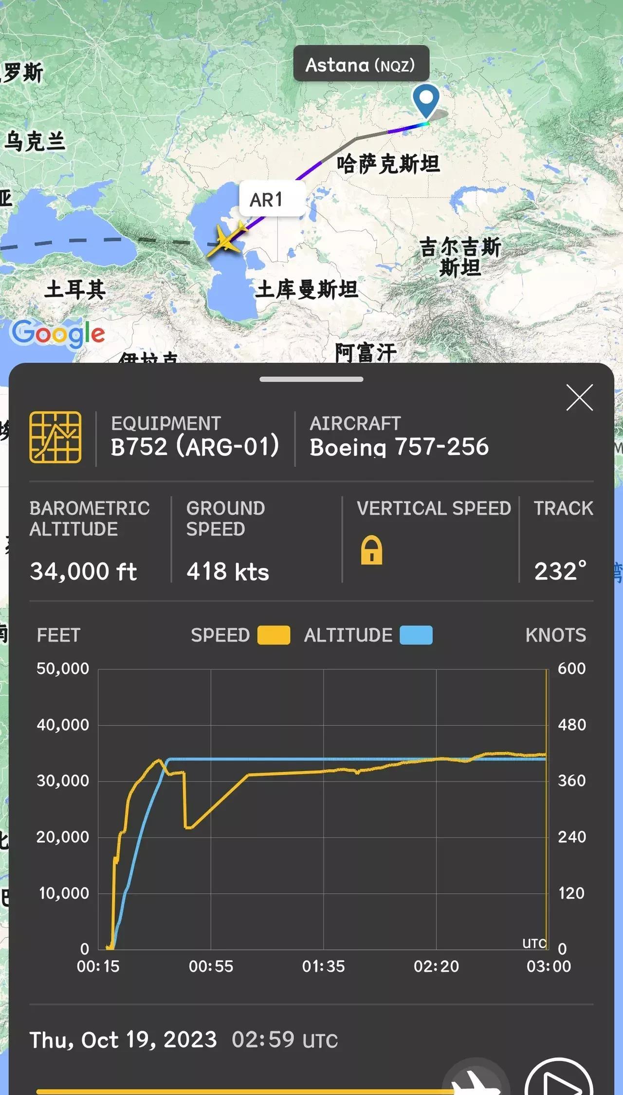 据悉,该专机已经在哈萨克斯坦努尔苏丹国际机场进行了第一次经停加油,随后又前往大西洋上方的加那利机场进行第二次加油准备,以为跨越大西洋的航程补充燃油。目前,飞机正在里海上空高空飞行,全程飞行速度较慢,因为需要逆风飞行。