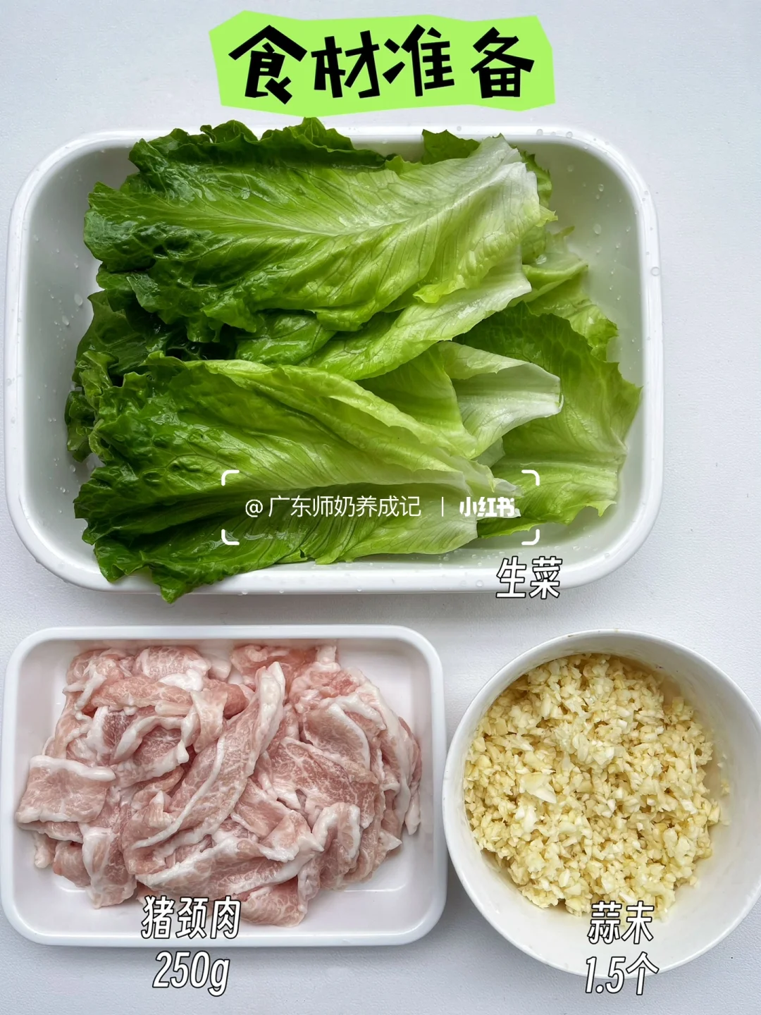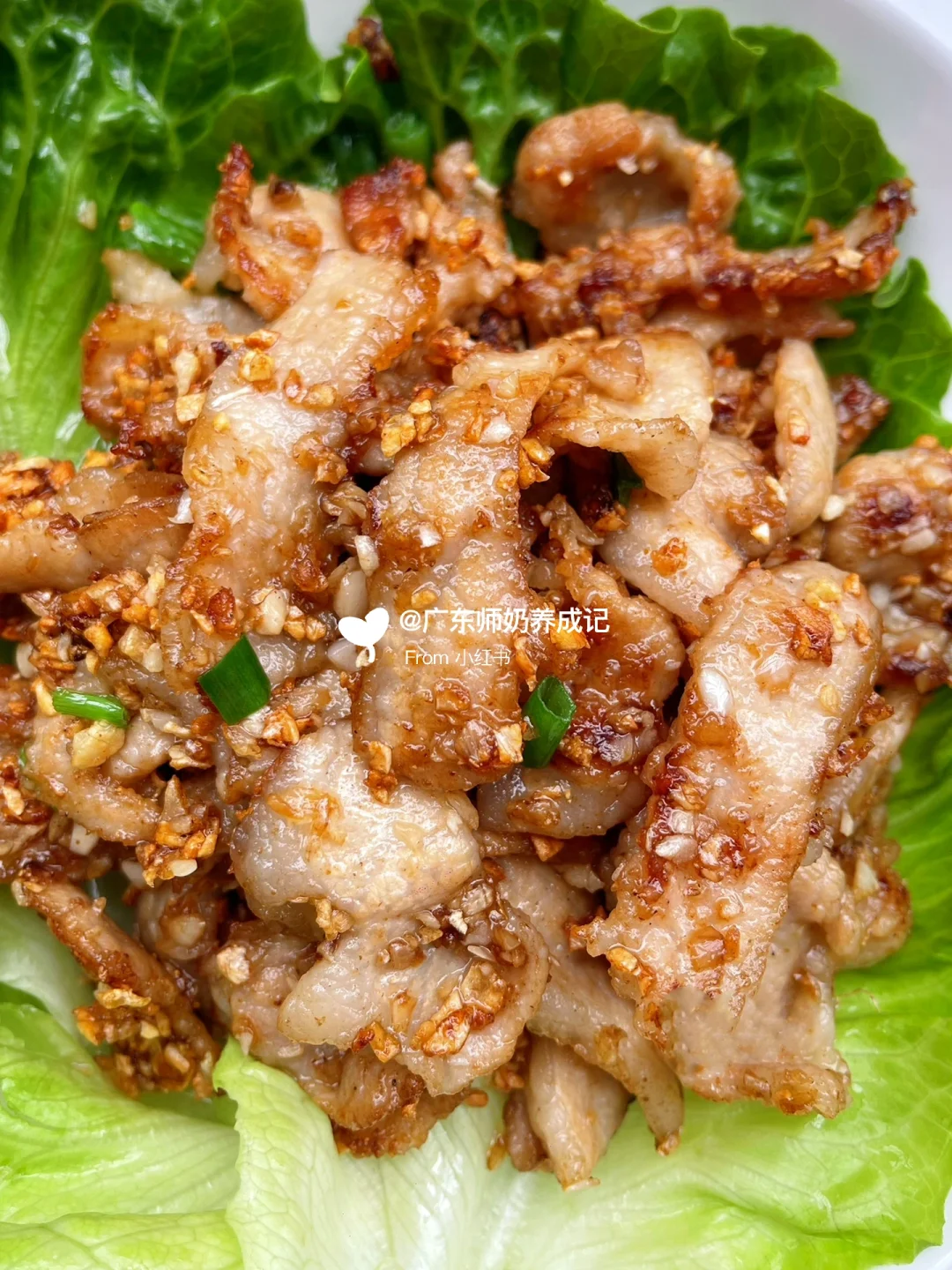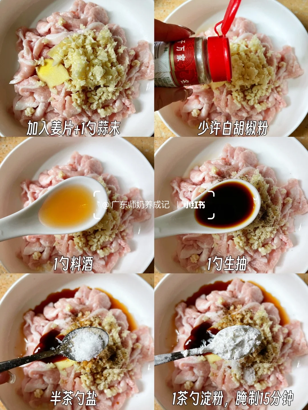 1⃣️猪颈肉切薄片,参考图片腌制;大蒜剁成末备用