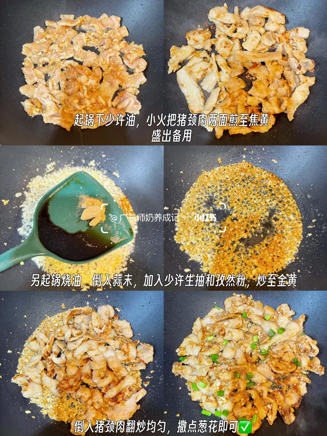 3⃣️用锅里的底油把蒜末炒香,加入少许生抽和孜然粉,倒入猪颈肉,翻炒均匀即可✅